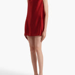A bell-shaped minidress distinguished by draped, scarf-inspired stand collar with horizontal seaming at back. Tailored in silky Italian twill selected for its crisp character and fluid drape. Button and concealed zipper at center back.
