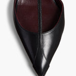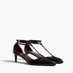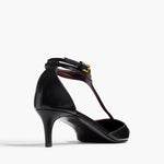 A supple, strappy heel that reimagines the t-strap, extending it with ribbon-like bands that loop around the ankle and secure with a gold buckle. Leather sole.