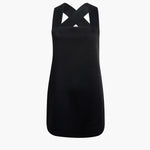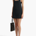 An apron-inspired minidress in bonded crepe satin selected for its dense, sculptural sheen. Halter neckline with straps that cross at back. Slips on.