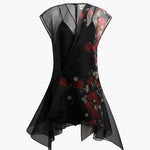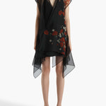 An easy-fitting and ethereal dress designed to highlight fluidly draped details, including a layered handkerchief hem. Cap-sleeved silhouette with surplice neckline. Button closure at elongated keyhole back. Includes silk slip.