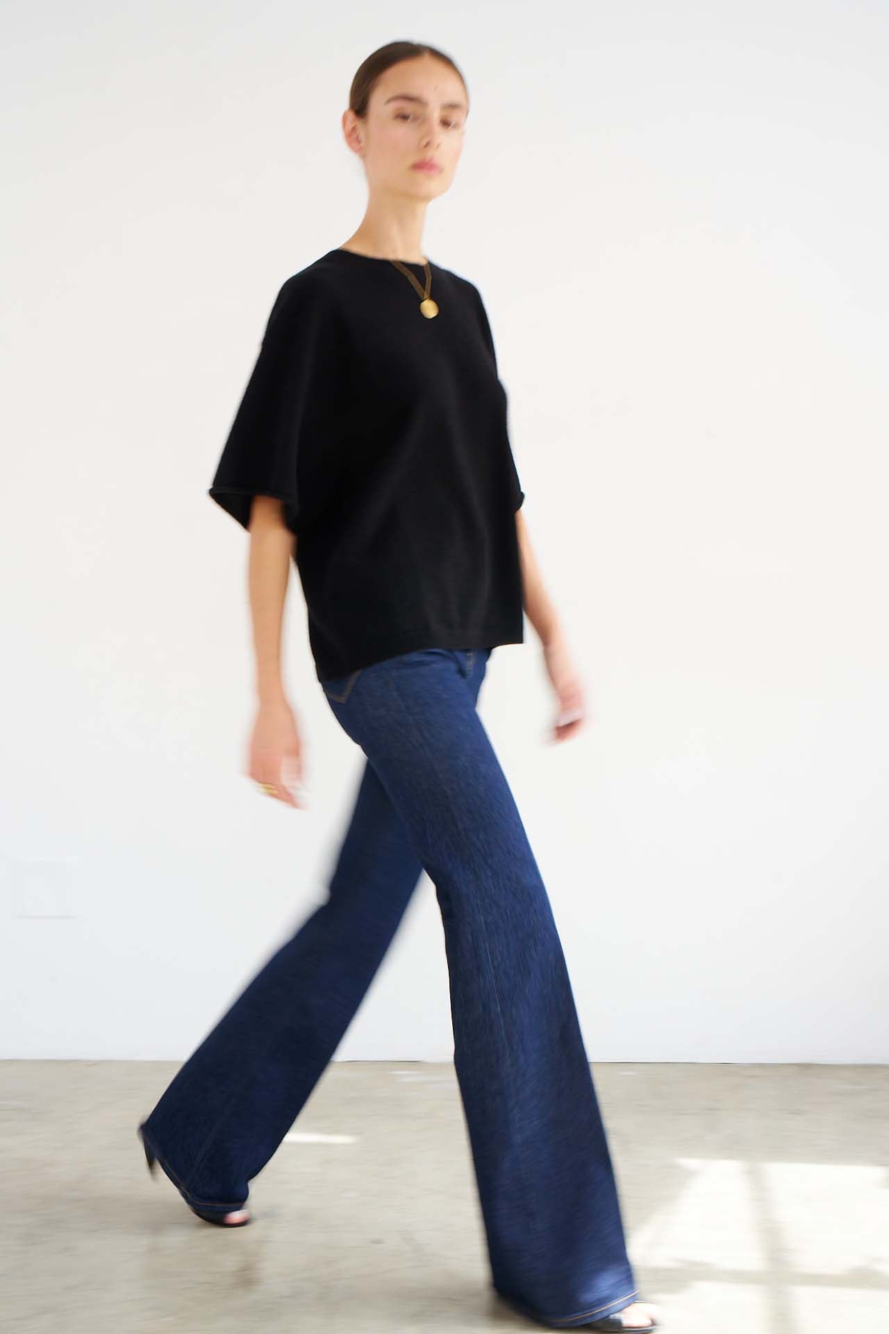 A modern, loose shape tee shirt knit in soft 12gg, lightweight cashmere.