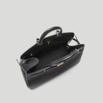 Exterior: Curved top edge, detachable and adjustable shoulder strap, dog-clip closure, two tubular handles with press-stud handle holders, back slip pocket, and gold-plated feet at the base.