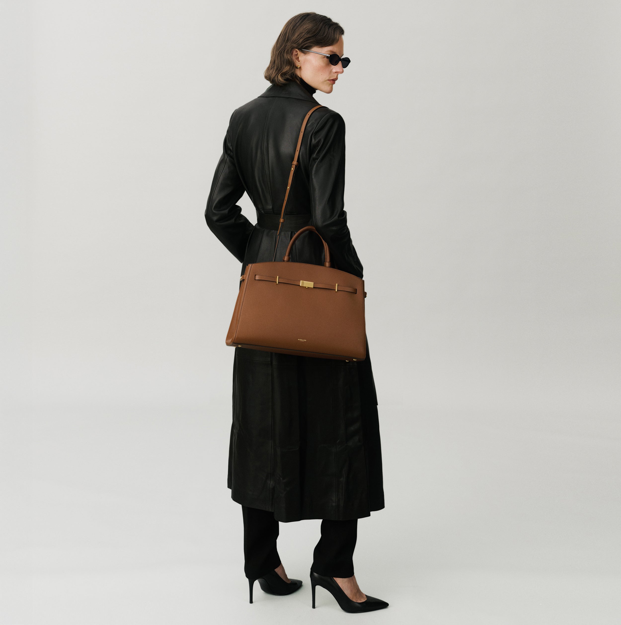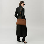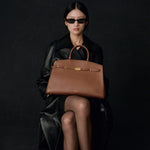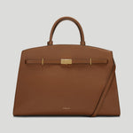 The Hudson is designed to empower, crafted to last. Featuring our signature belted strap and gold-plated lock, it embodies both strength and sophistication. Versatile and spacious, it adapts effortlessly to everyday needs, with expandable side panels that adjust with stud fastenings to provide extra space. Securely closed with a dog clip fastening, it ensures essentials stay safe, while the two leather handle holders keep the top handles neatly together. Complete with a top handle and an adjustable, removable strap for various styling options, this sophisticated day bag can be carried by hand, on the crook of the arm, or as a crossbody. Ethically made from sustainably sourced, LWG gold-rated Italian leather, The Hudson blends timeless style with contemporary refinement.