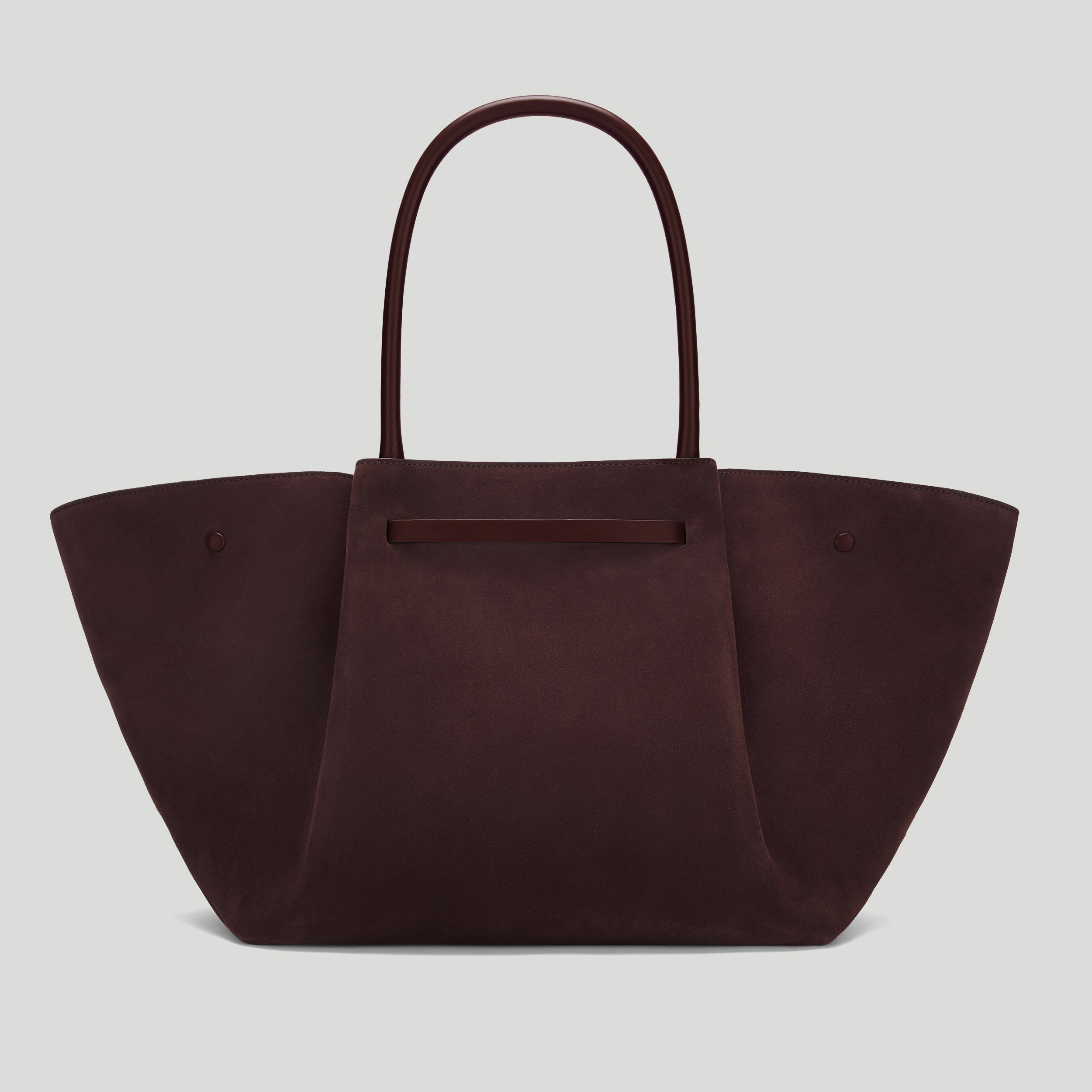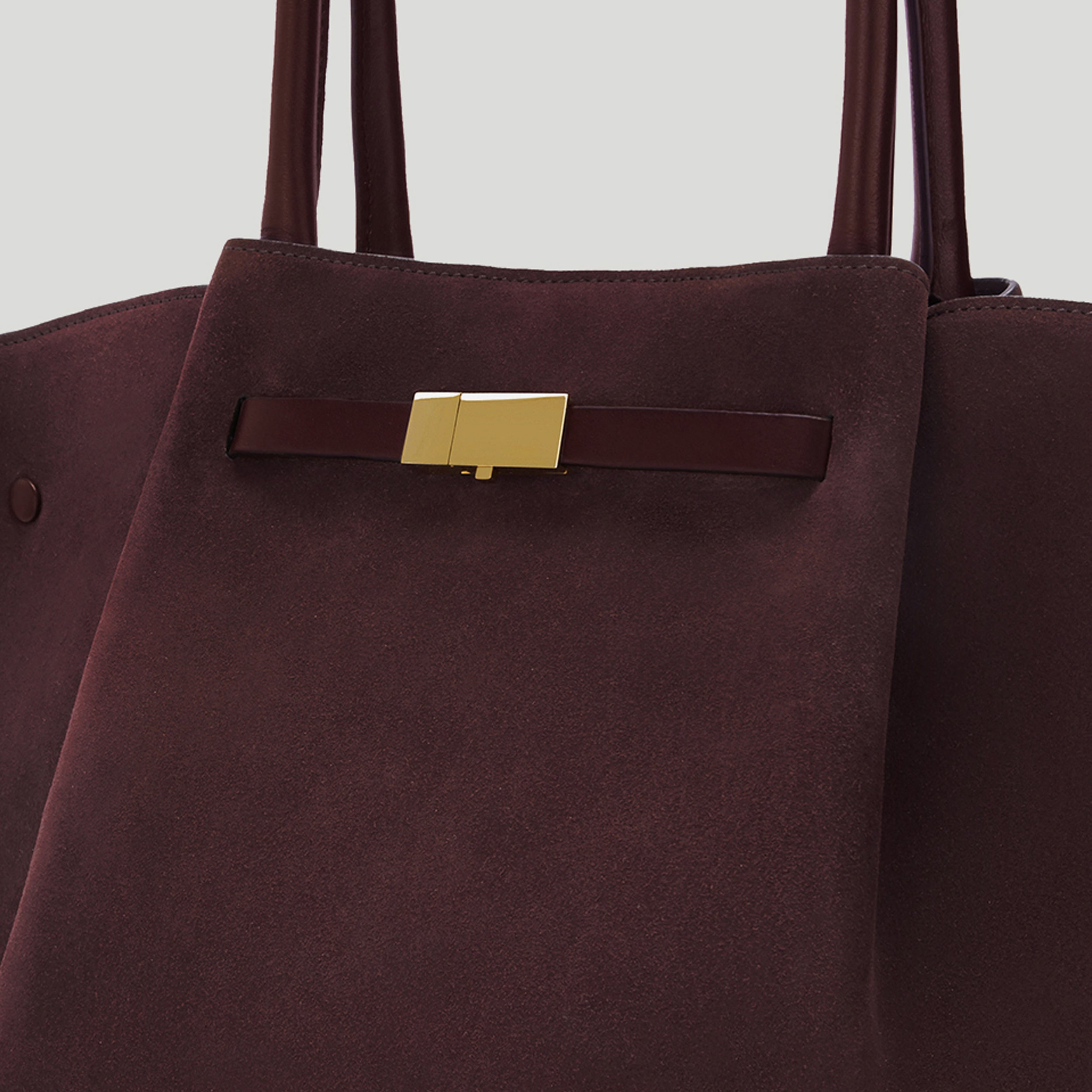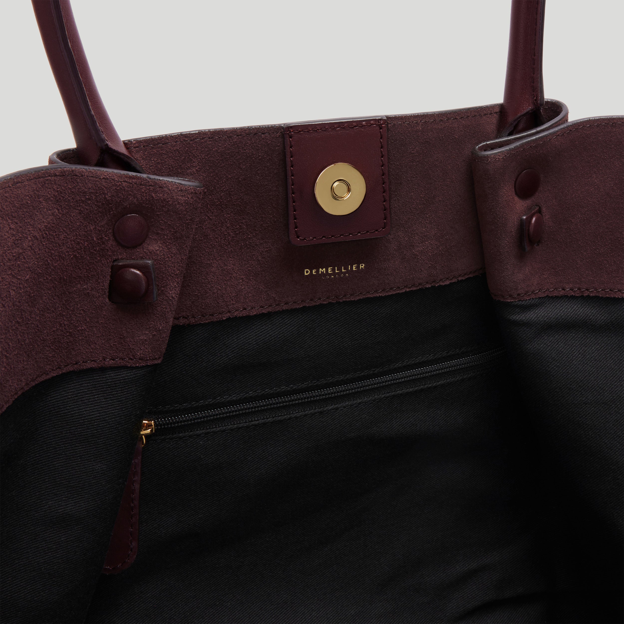 Exterior: Double top handles, metal feet, unique triangular fold design, foil embossed DeMellier logo.