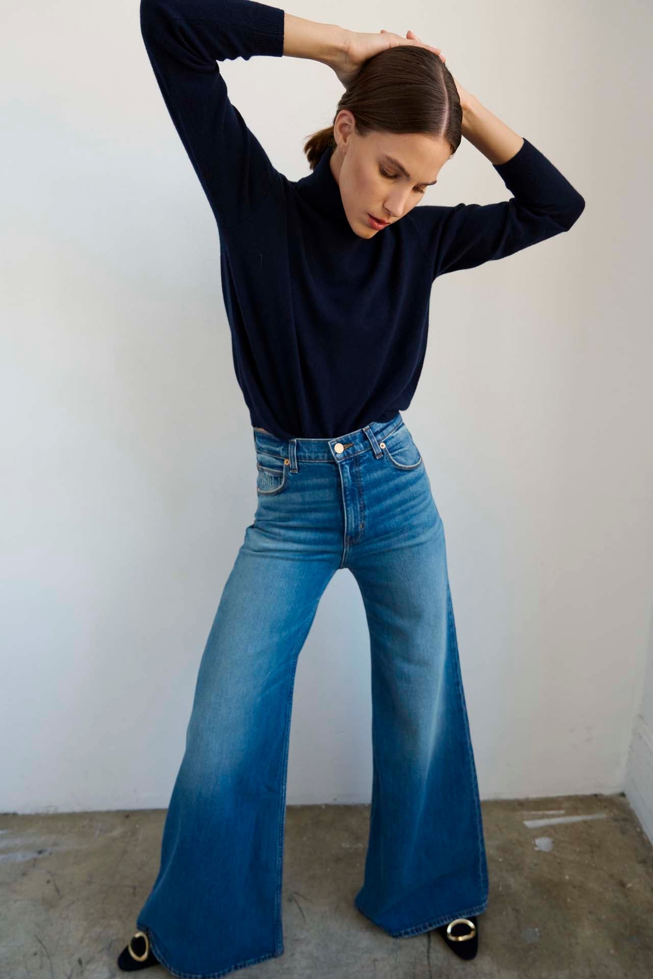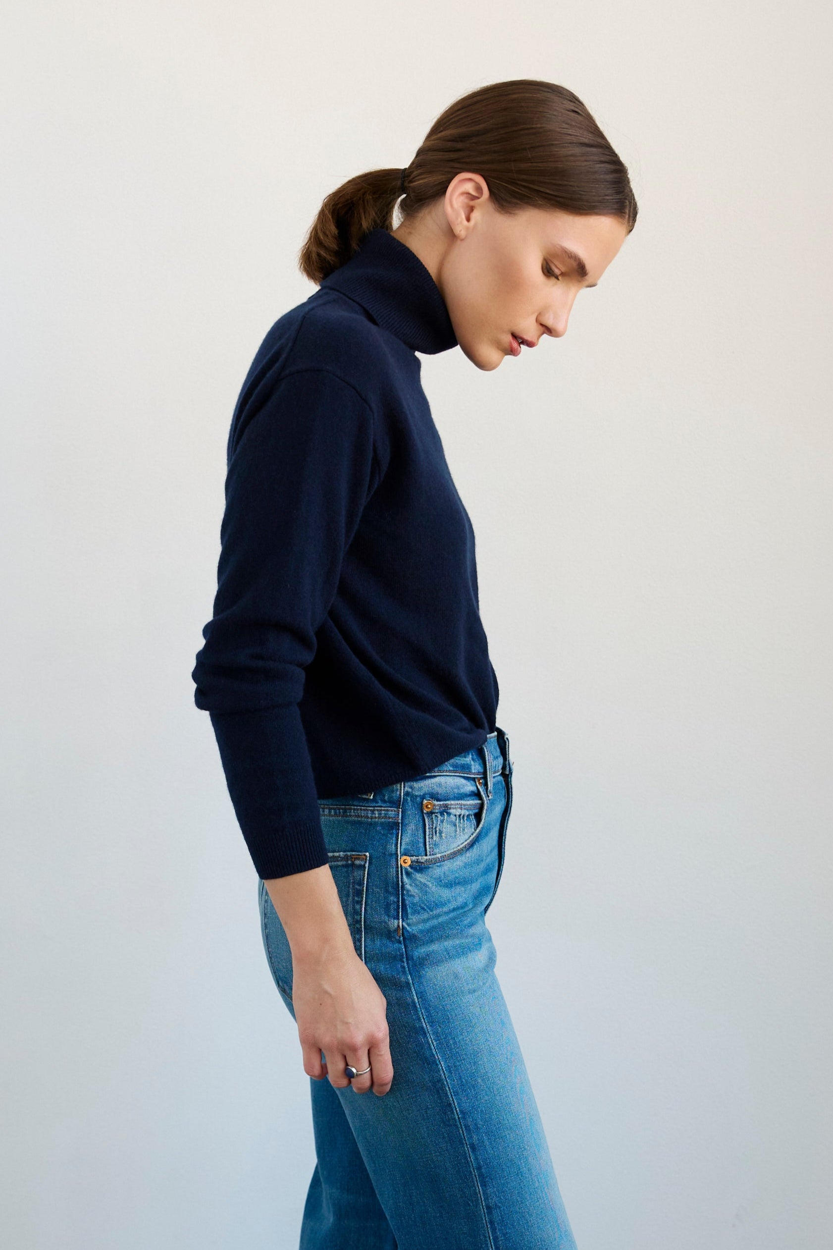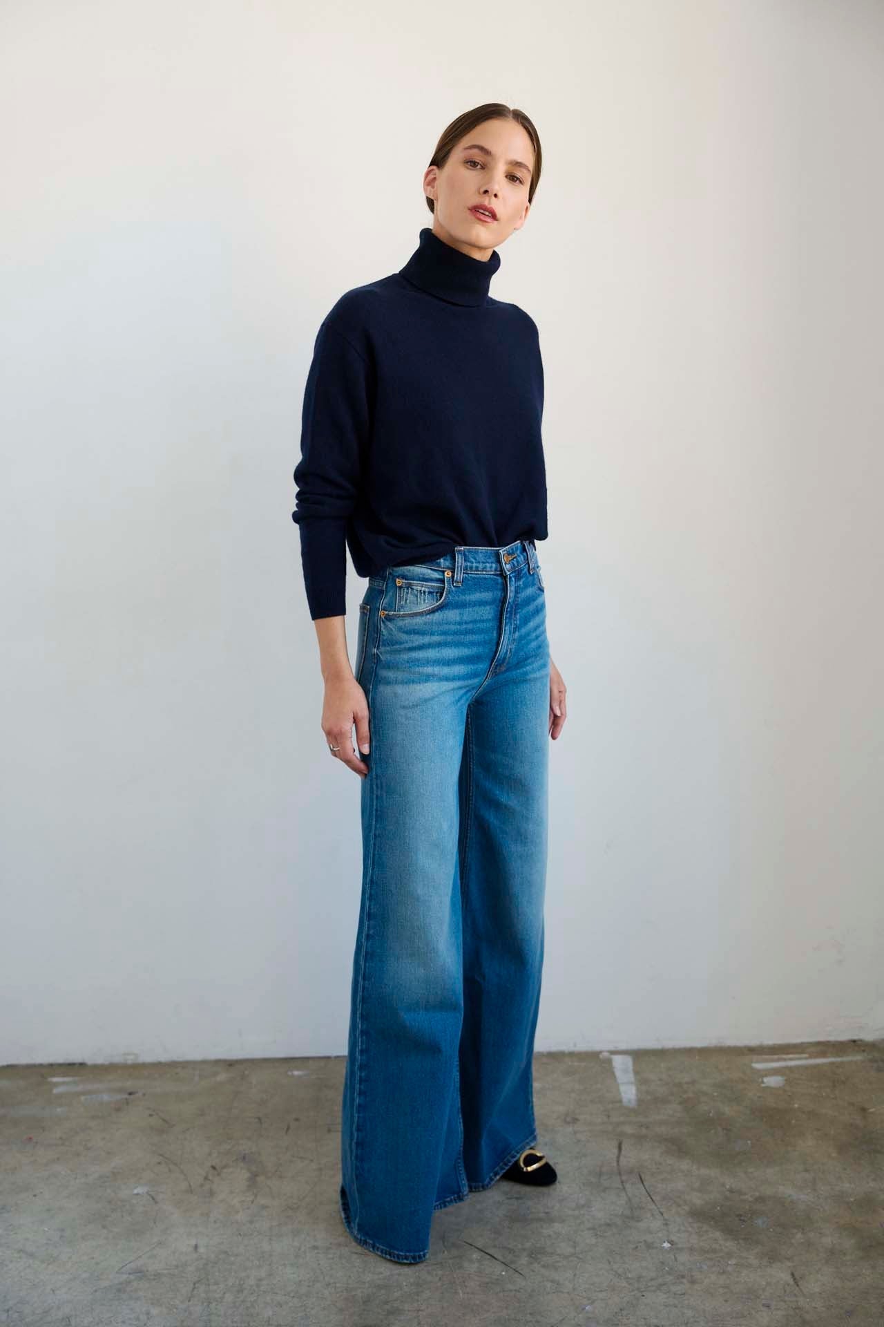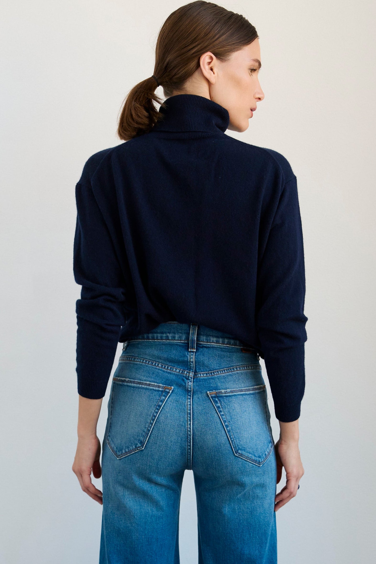 A relaxed fit sweater with an elongated turtle neck and slim sleeve define the Primm Sweater. Our tee shirt weight cashmere is soft, washed in for a “like butter” hand feel that becomes a second skin. A lightweight rib waistband finishes the sweater. It is soft and easy to tuck in.