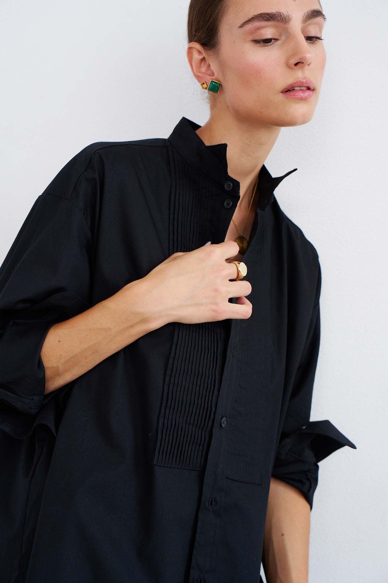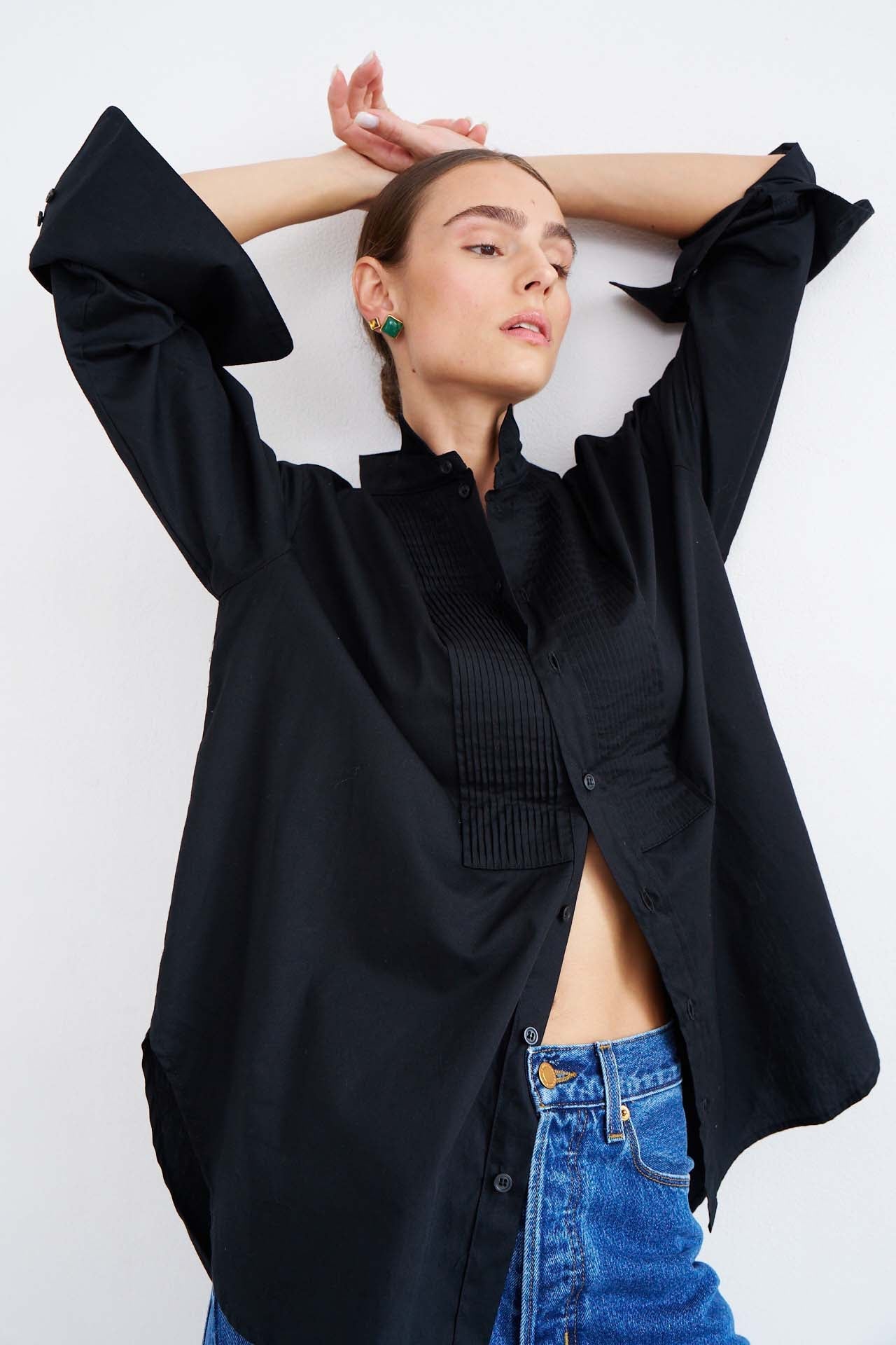 Inspired by a traditional mens tuxedo shirt.  Rooted in black tie with a west coast perspective.  A cult classic. Tailored in Los Angeles using Japanese piece dyed poplin.