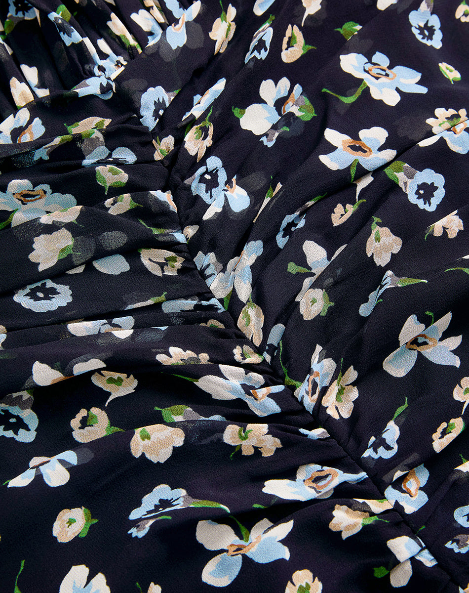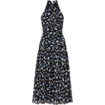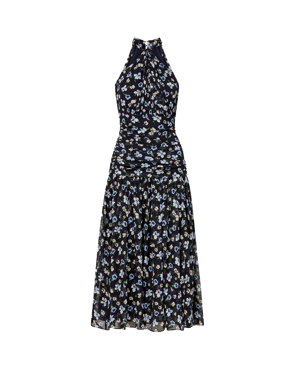 An iconic dress for all your spring events. Crafted from 100% silk, the Brock features an allover floral print and a flattering, slim fit. The ruched drop waist accentuates the waistline before flowing into a fluttery midi skirt with a side slit for ease. A crisscross halter neckline and back keyhole with a double-button closure complete the look. Style with dainty heel and a rattan clutch for your next spring wedding or garden cocktail.