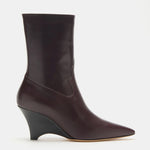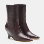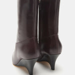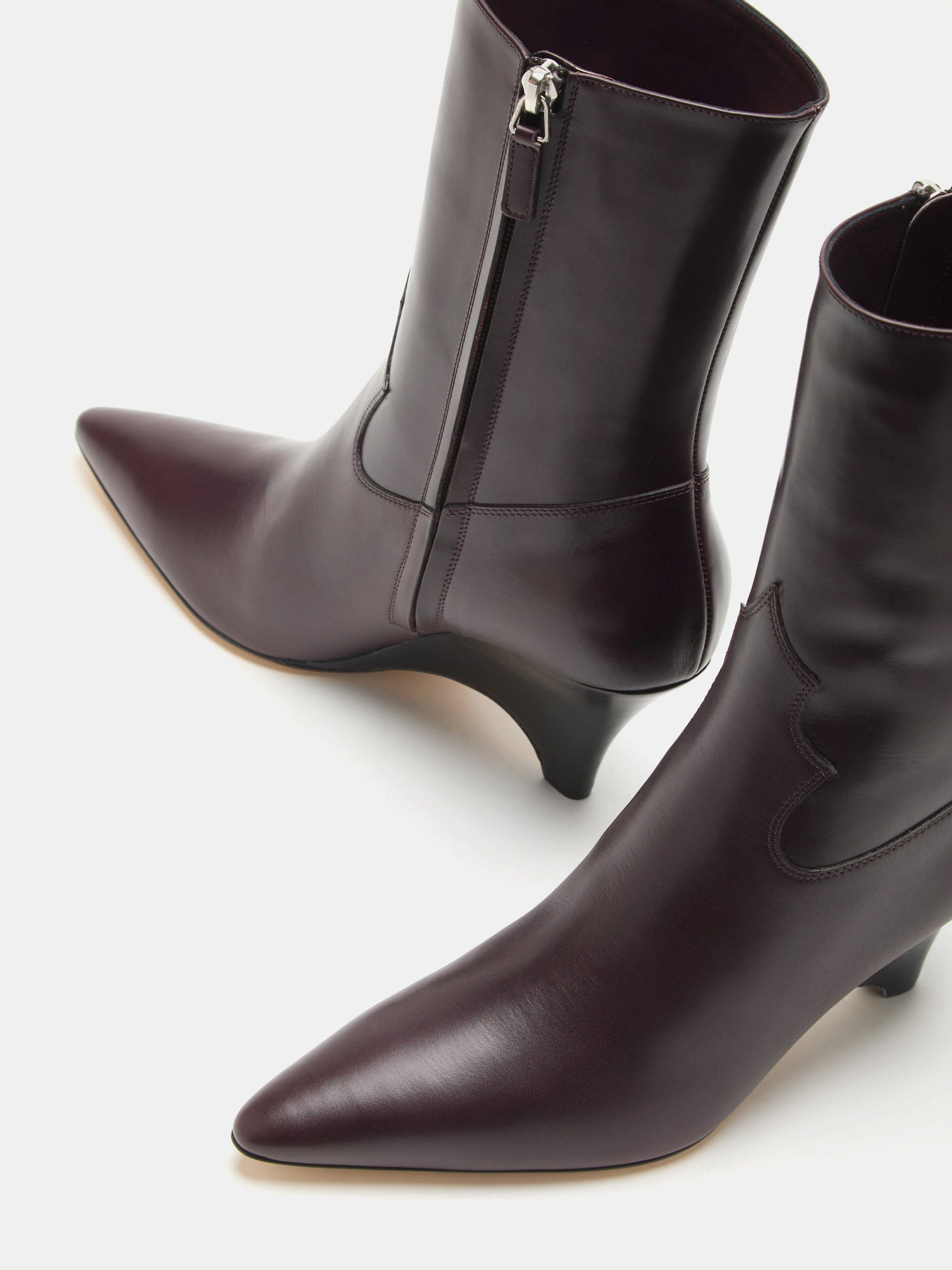 Camille Tall Boot, handcrafted in plum leather, with a pointy toe and cushioned calf leather insole. 70mm heel. Zip fastening. Made in Italy.