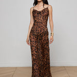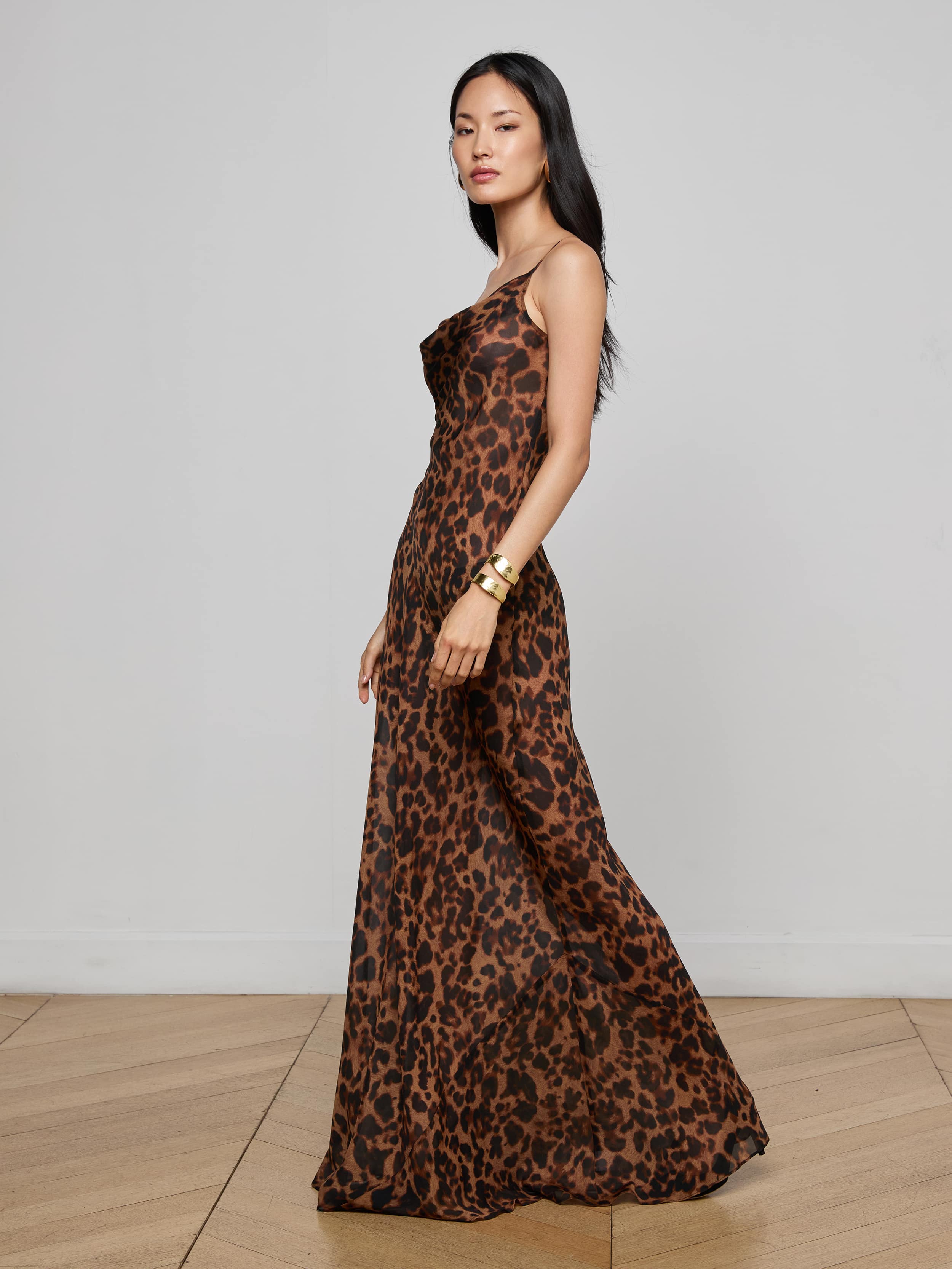 The Christine gown drapes effortlessly over the figure in an easy wear-‘till-dawn fit. Crafted from lustrous silk in a bold leopard print, it’s a striking yet timeless statement piece. Style it with strappy heels and minimal jewelry for a sleek, sophisticated finish.