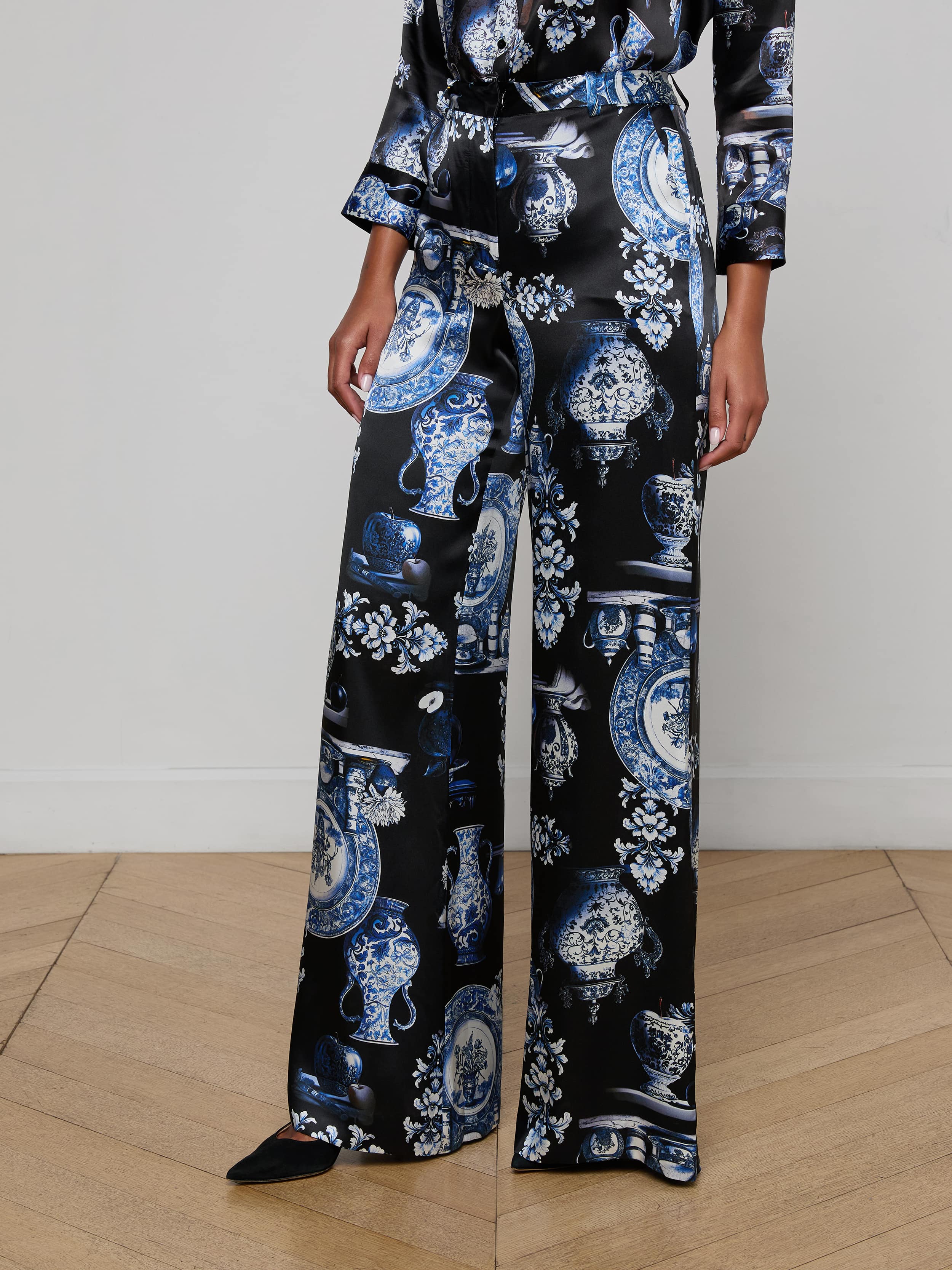 Pilar is the perfectly proportioned pant, renewed each season in fresh fabrications and colorways. Now in 100% silk with a bold porcelain print.