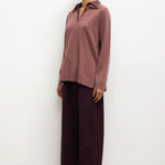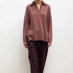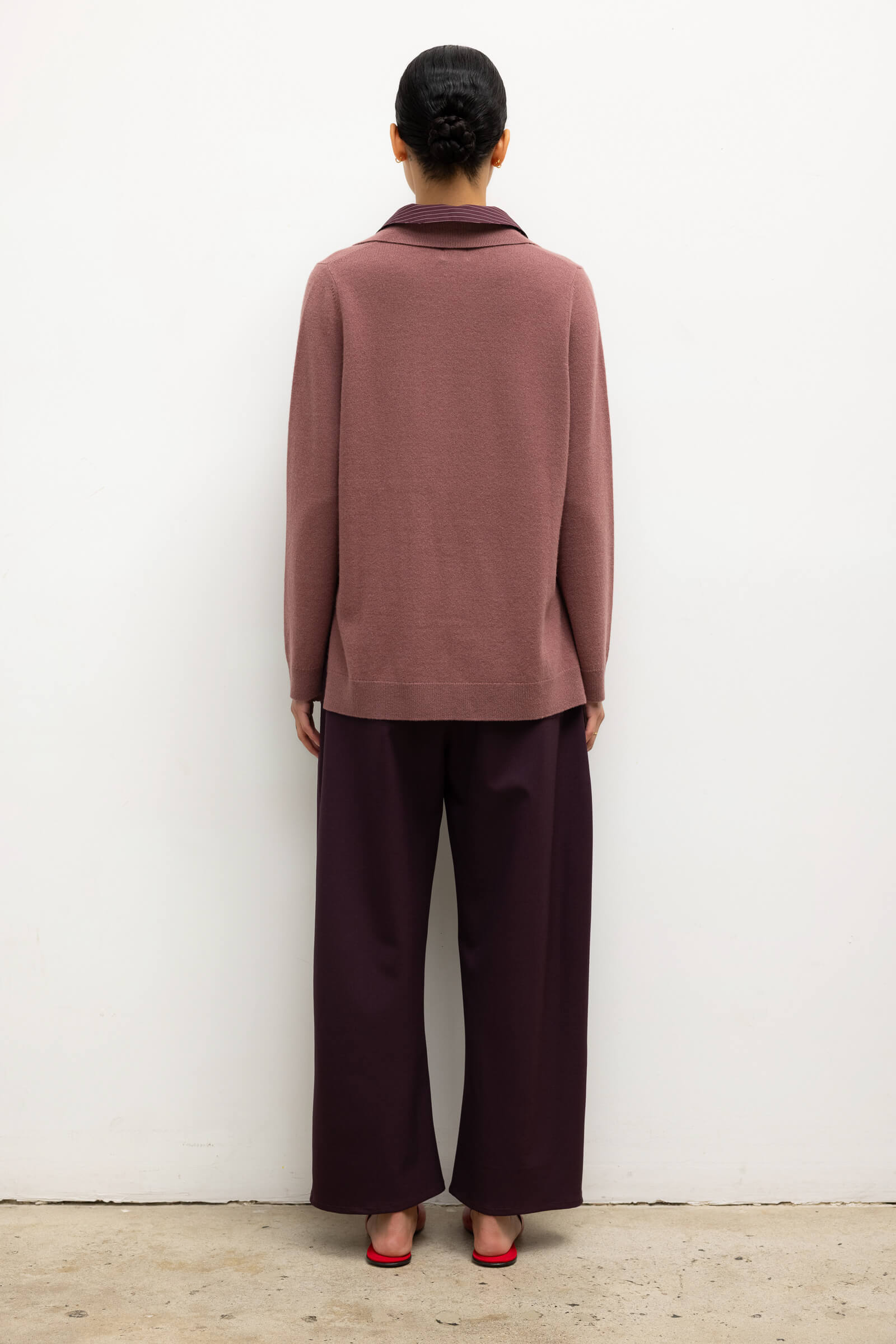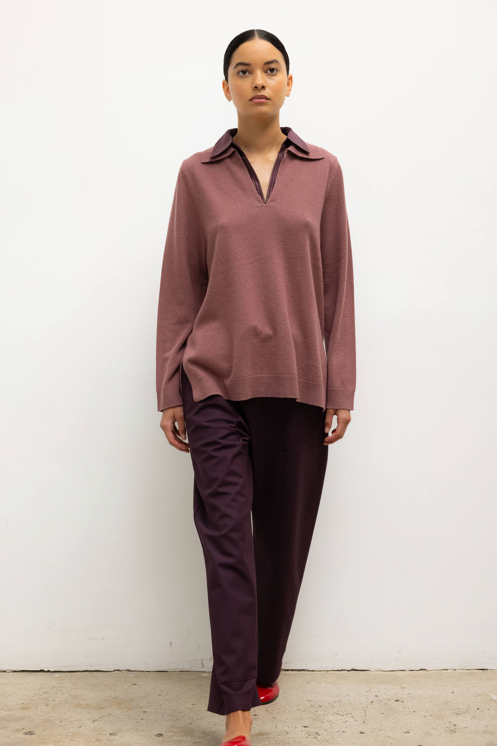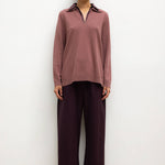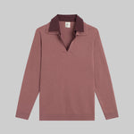 Knit in our plush Zoe Wool/Cashmere Knit, The Zoe Yoshi Polo features a V neckline and a faux half-shirt Yoshi Cotton Twill collar. We're wearing this with The Yoshi Classic Tie Pant in matching Bordeaux/Rose Stripe.