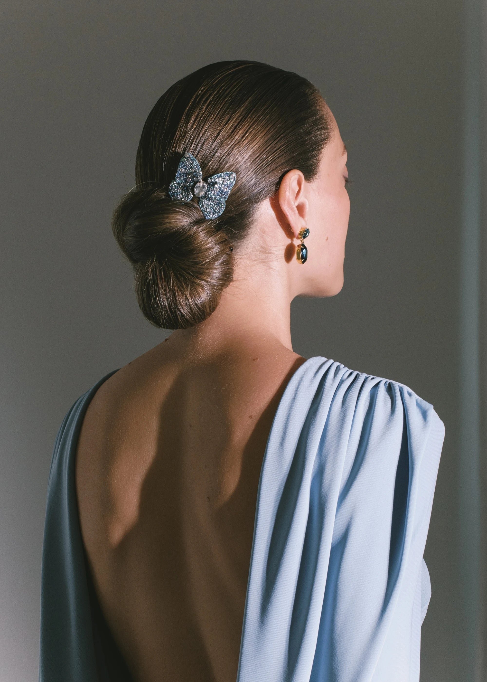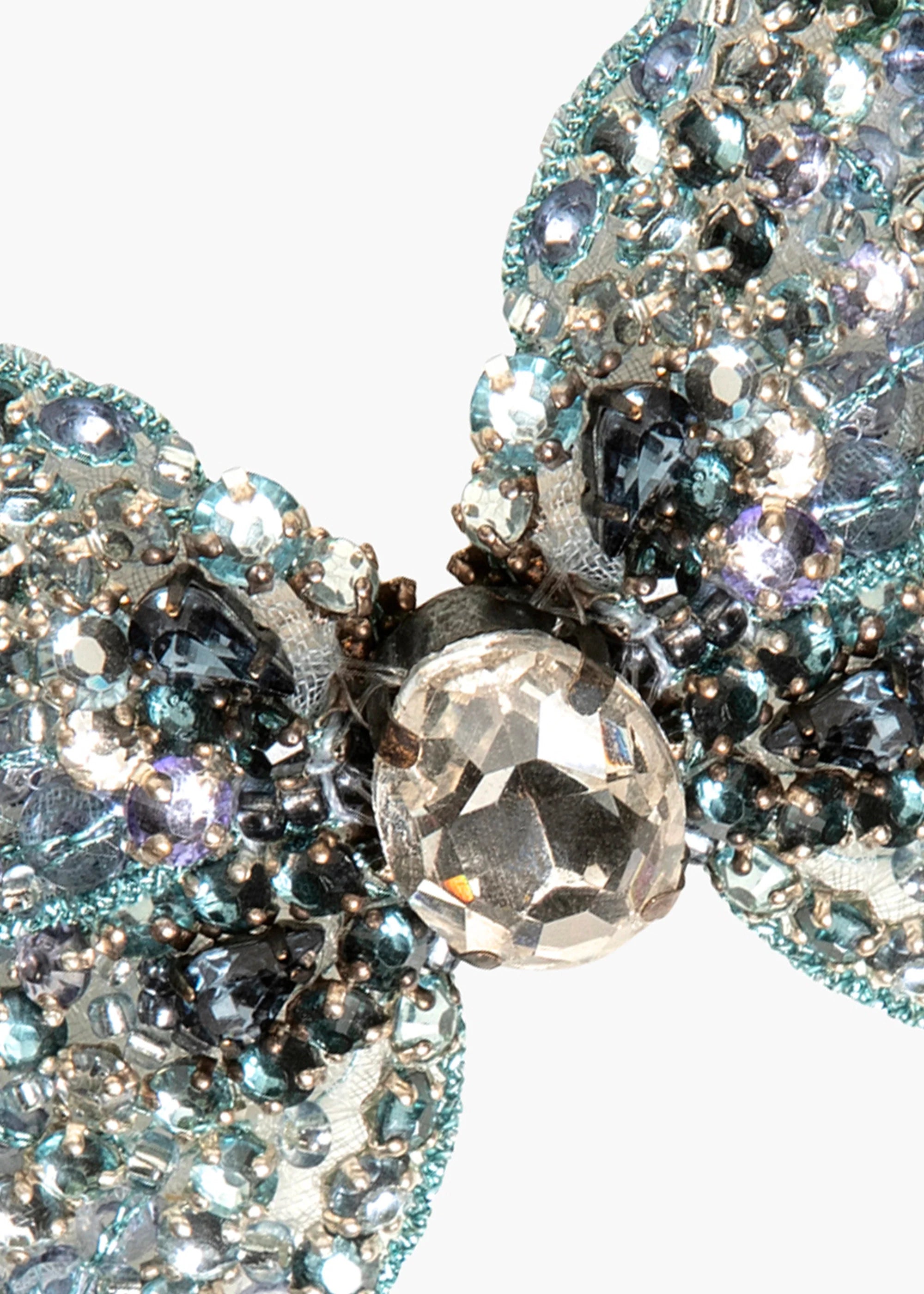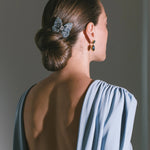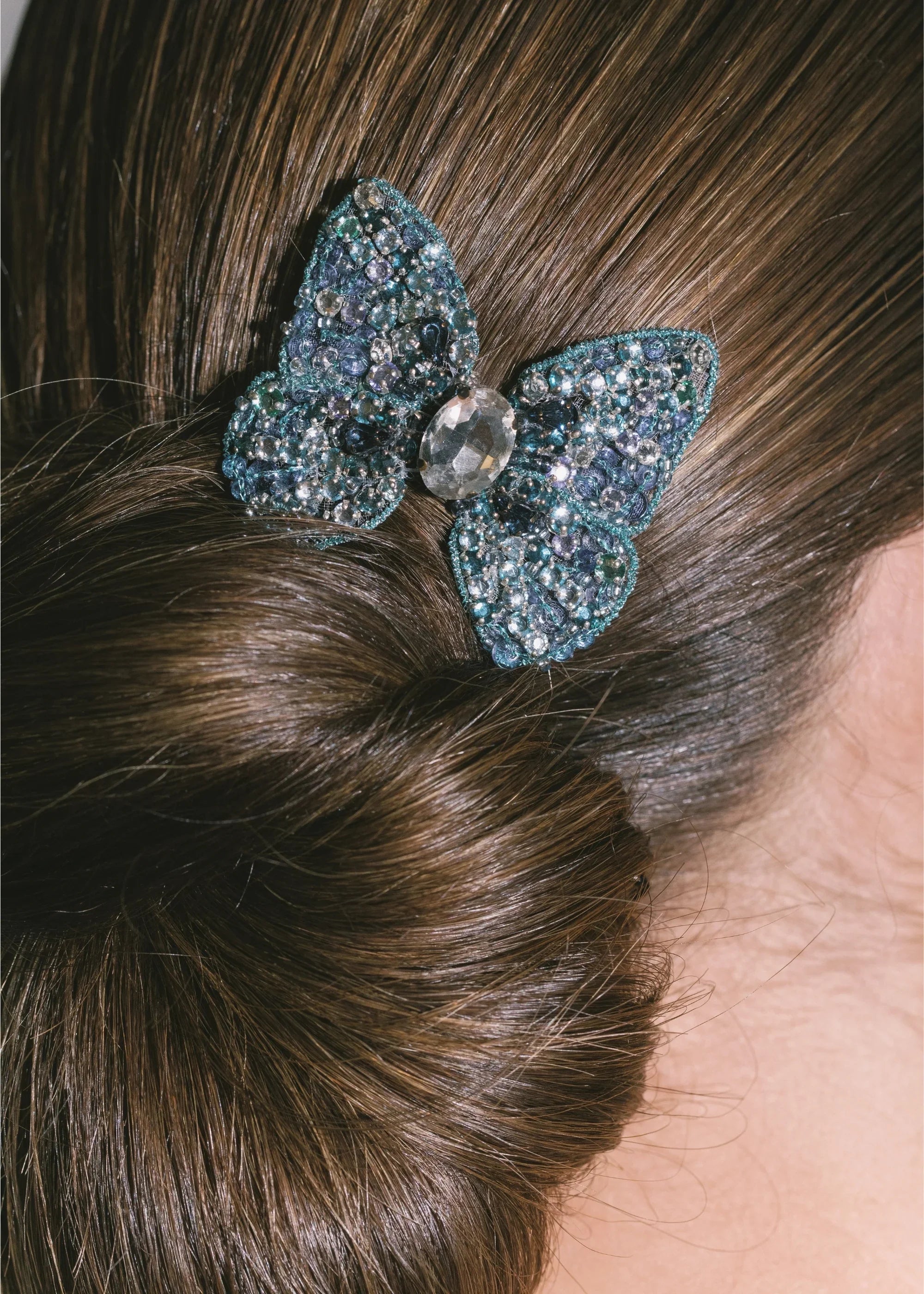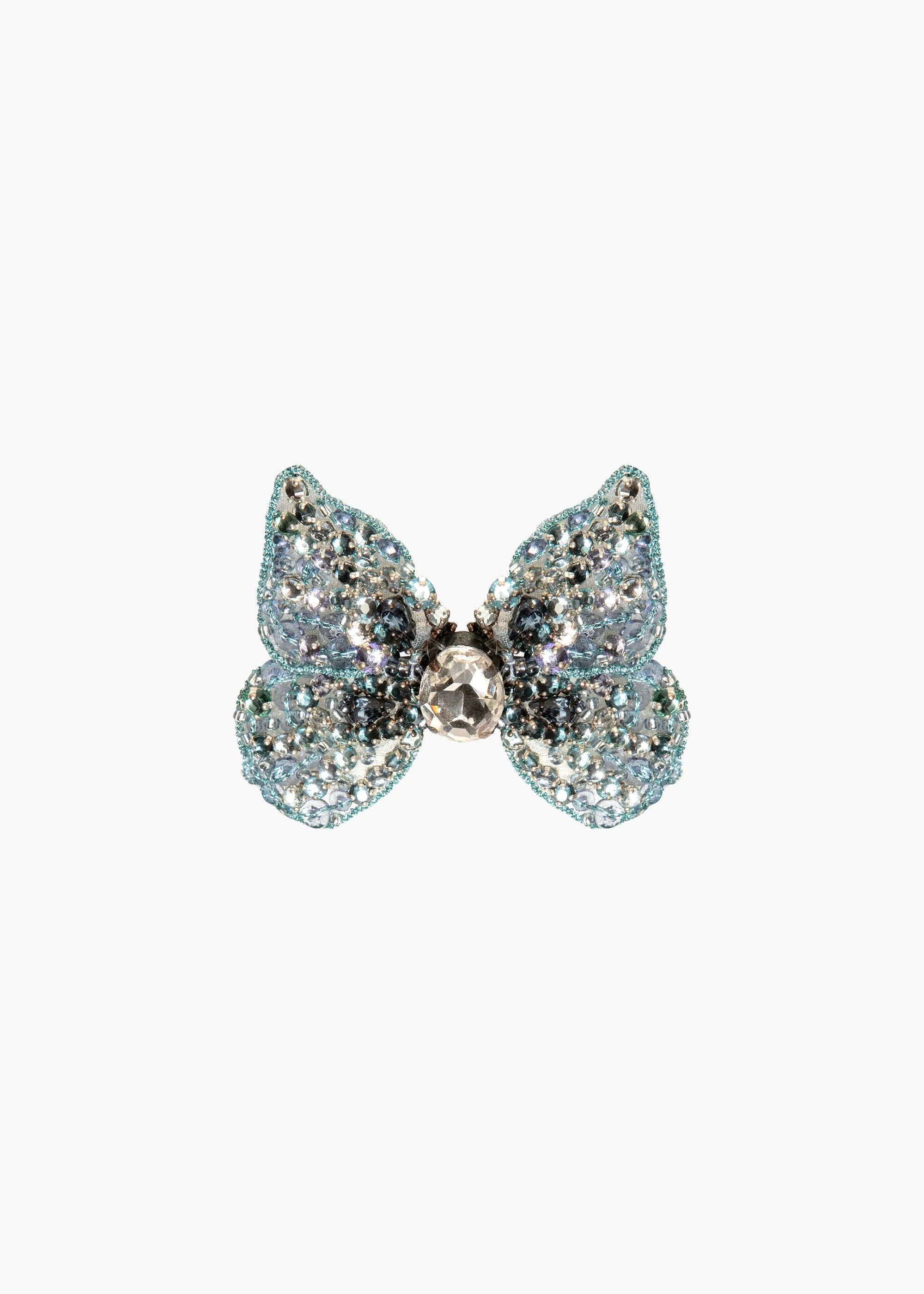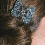 The Abbie Barrette is made by hand in New York, with hand-embroidered Austrian crystals scattered across silk chiffon, dip-dyed to create an ombré effect. The butterfly is wired by hand to create its nuanced, lifelike shape— butterflies are integral to the Jennifer Behr brand, representing spiritual rebirth and connection to the divine. Each one is finished with a French flip clip for secure placement anywhere in the hair— layer multiples at once for a dramatic finished look.