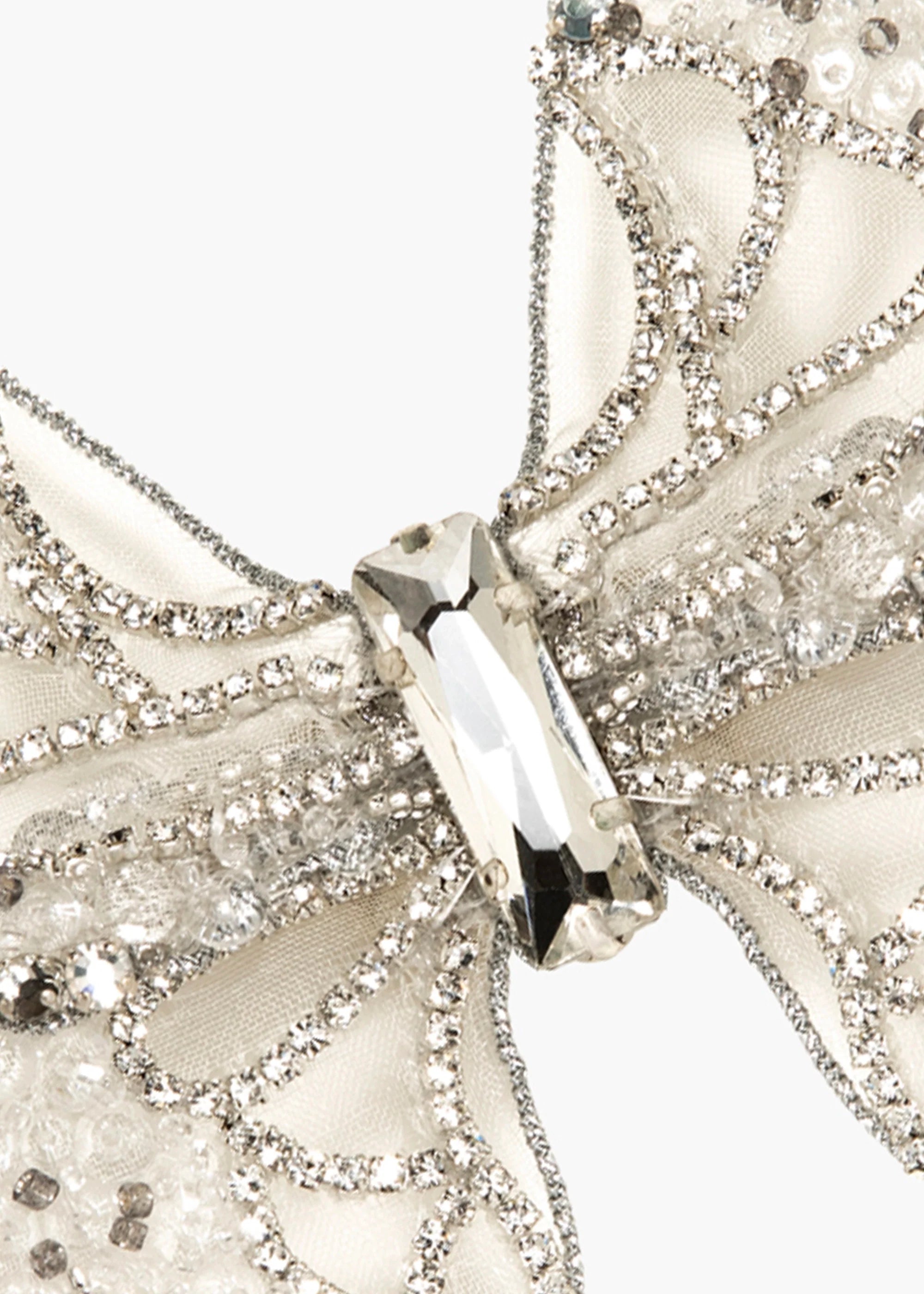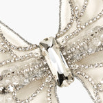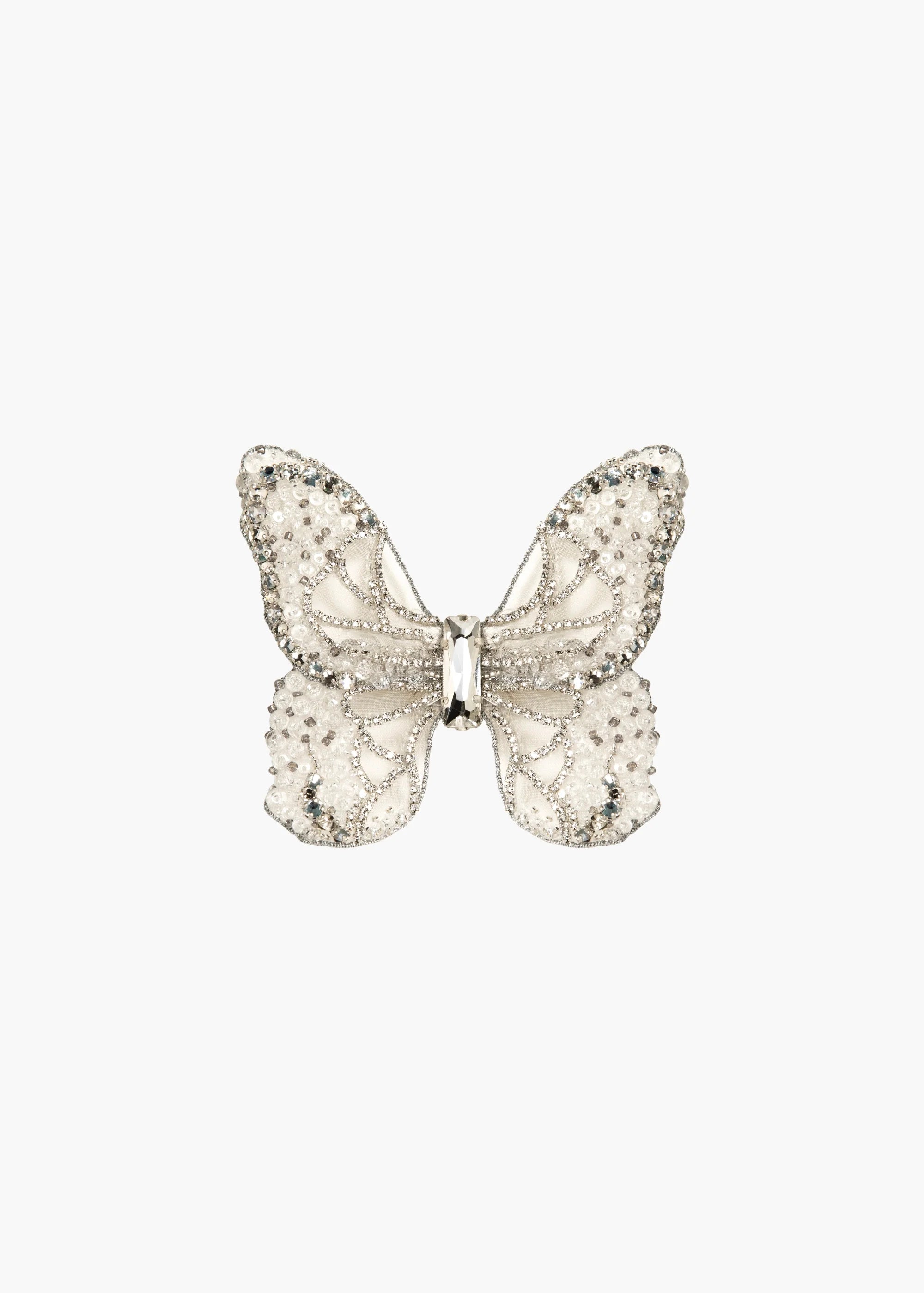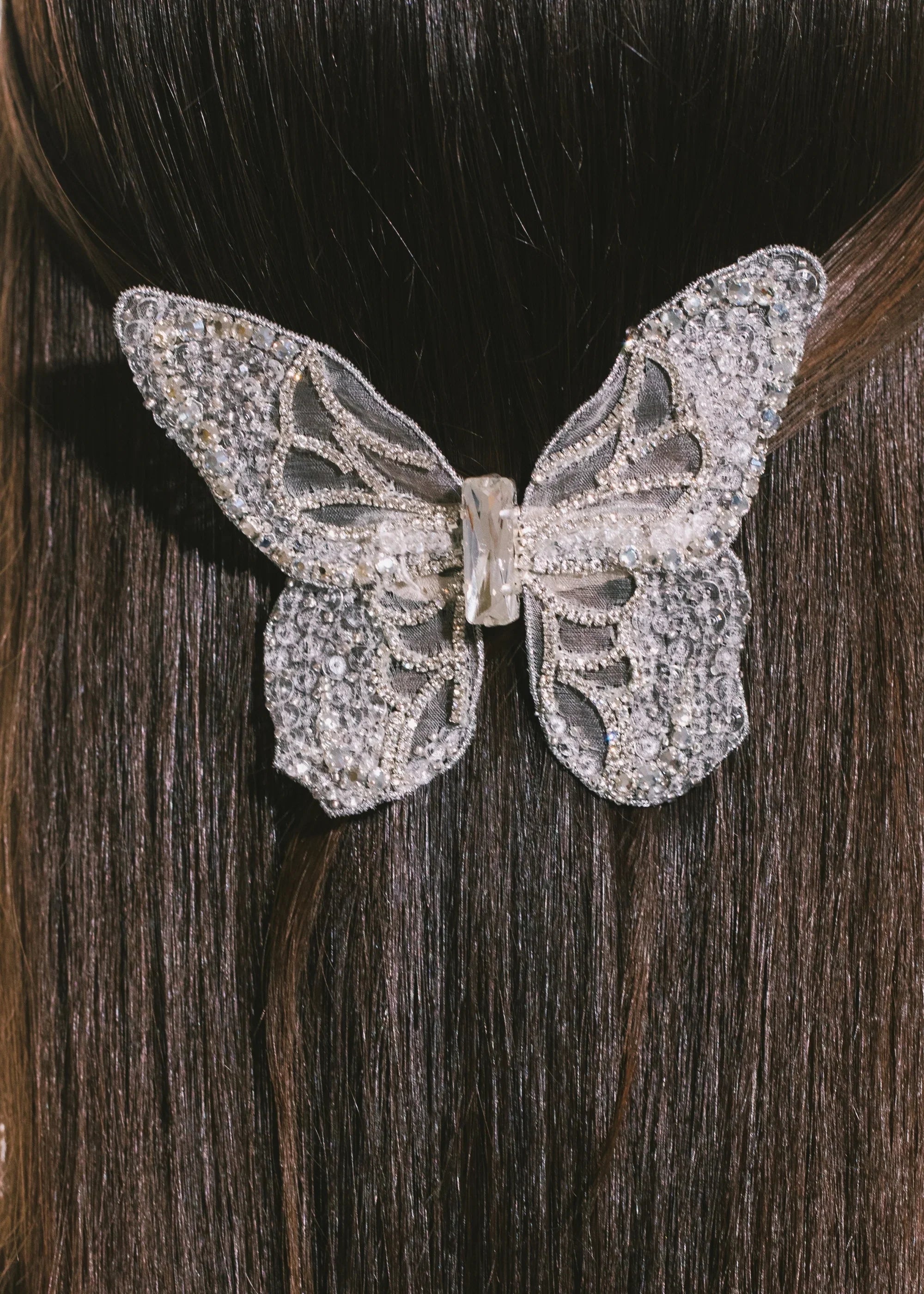 More akin to a piece of fine jewelry than a hair clip, the Absolem Barrette is made by hand in New York, with hand-embroidered Austrian crystals scattered across silk chiffon, dip-dyed to create a vivid ombré effect. Butterflies are iconic emblems of the Jennifer Behr brand, signaling spiritual rebirth and connection to the divine. The butterfly is wired by hand to create the nuanced, lifelike shape, and each one is finished with a French flip clip for secure placement anywhere in the hair— layer multiples at once for a dramatic finished look.