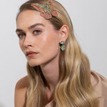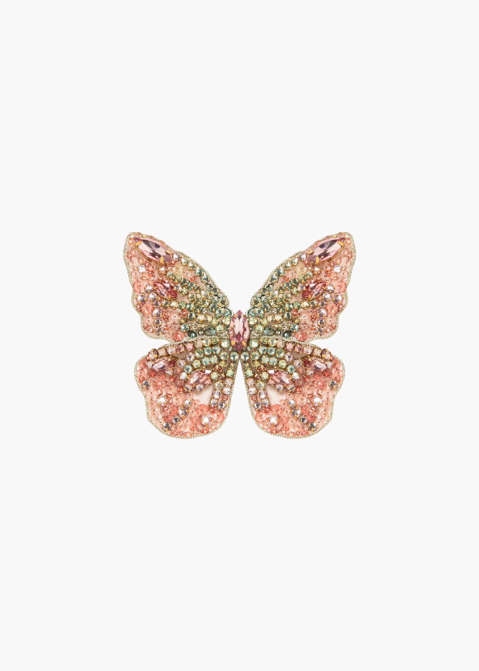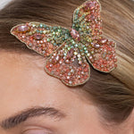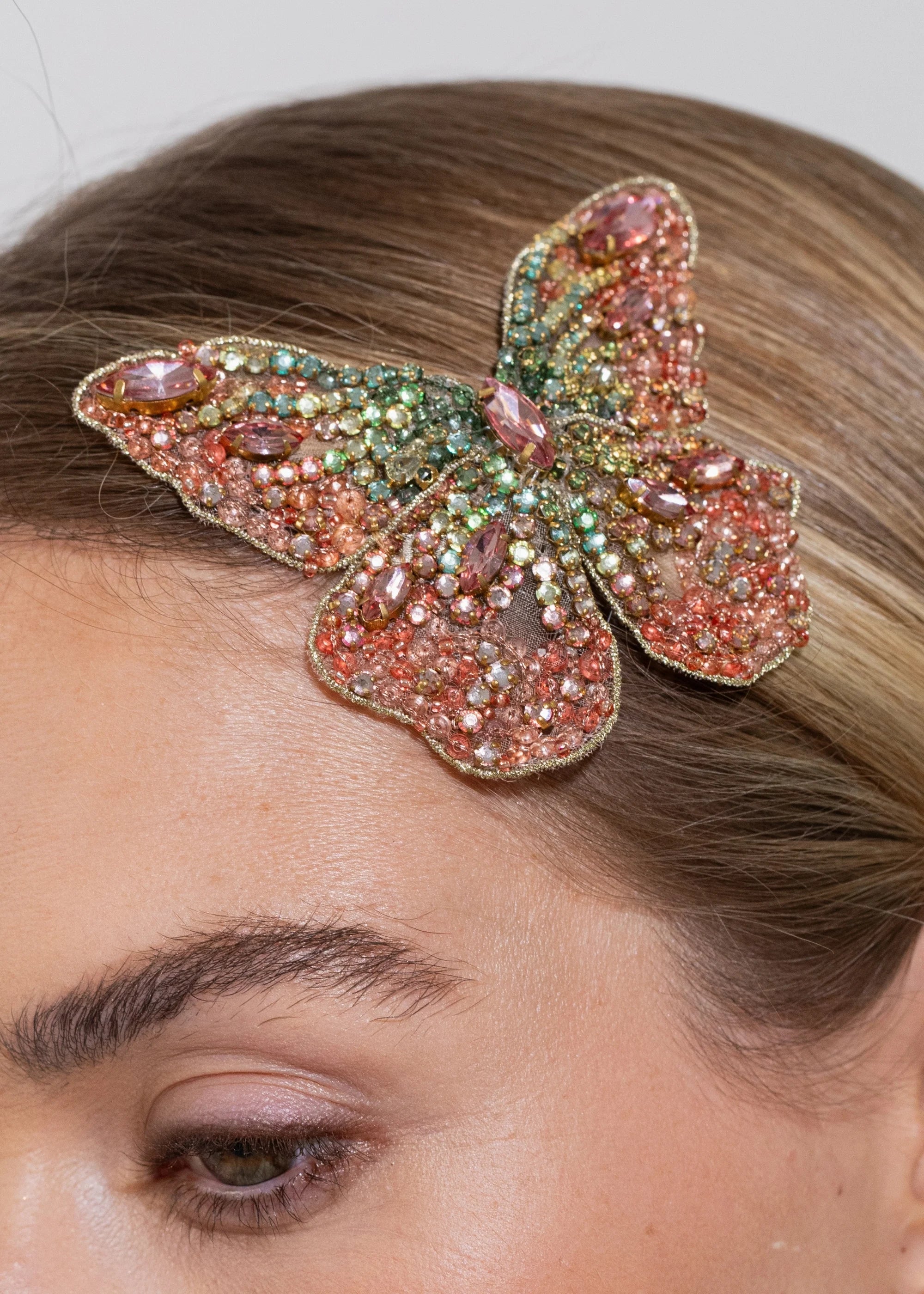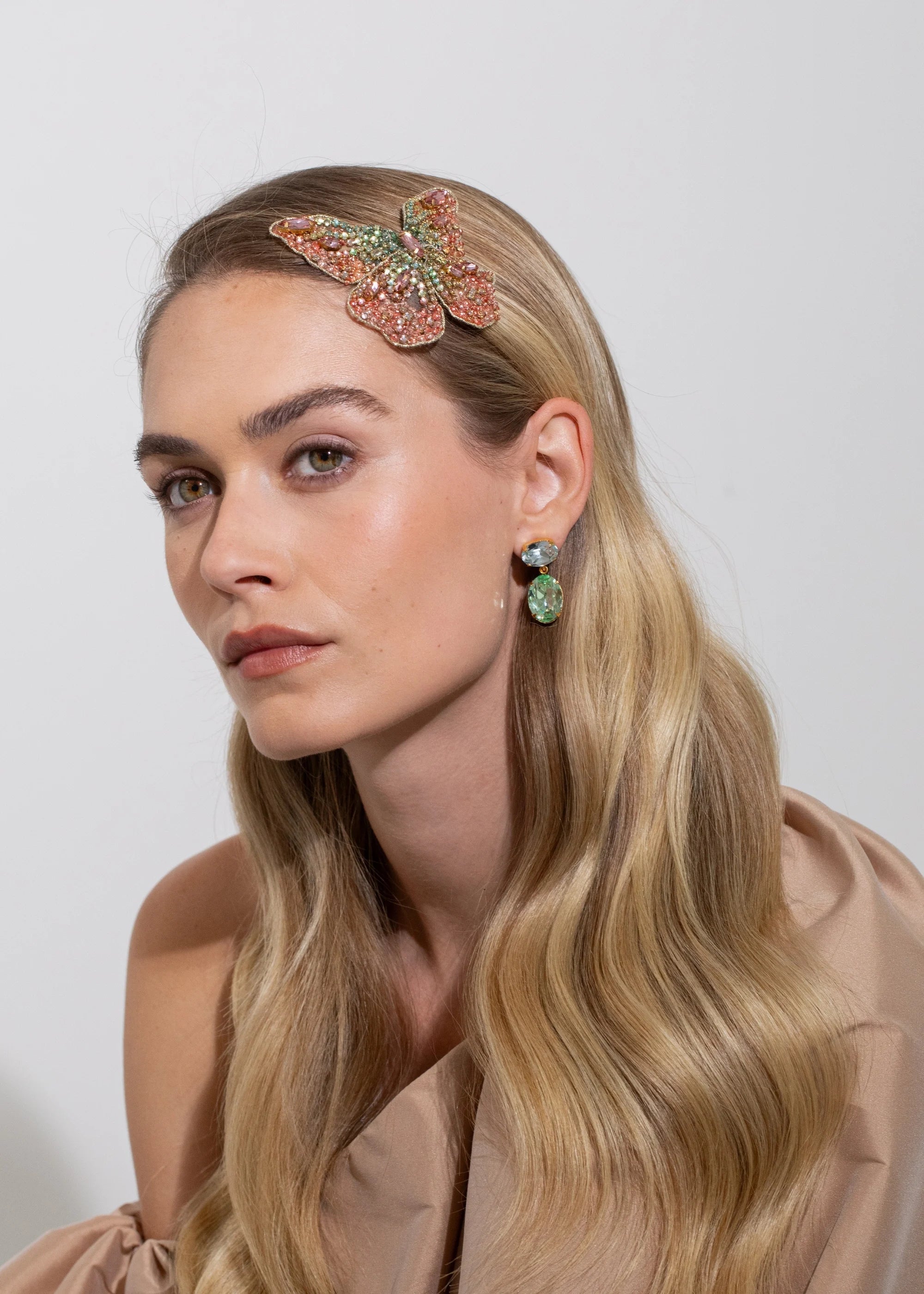 More akin to a piece of fine jewelry than a hair clip, the Absolem Barrette is made by hand in New York, with hand-embroidered Austrian crystals scattered across silk chiffon, dip-dyed to create a vivid ombré effect. Butterflies are iconic emblems of the Jennifer Behr brand, signaling spiritual rebirth and connection to the divine. The butterfly is wired by hand to create the nuanced, lifelike shape, and each one is finished with a French flip clip for secure placement anywhere in the hair— layer multiples at once for a dramatic finished look.