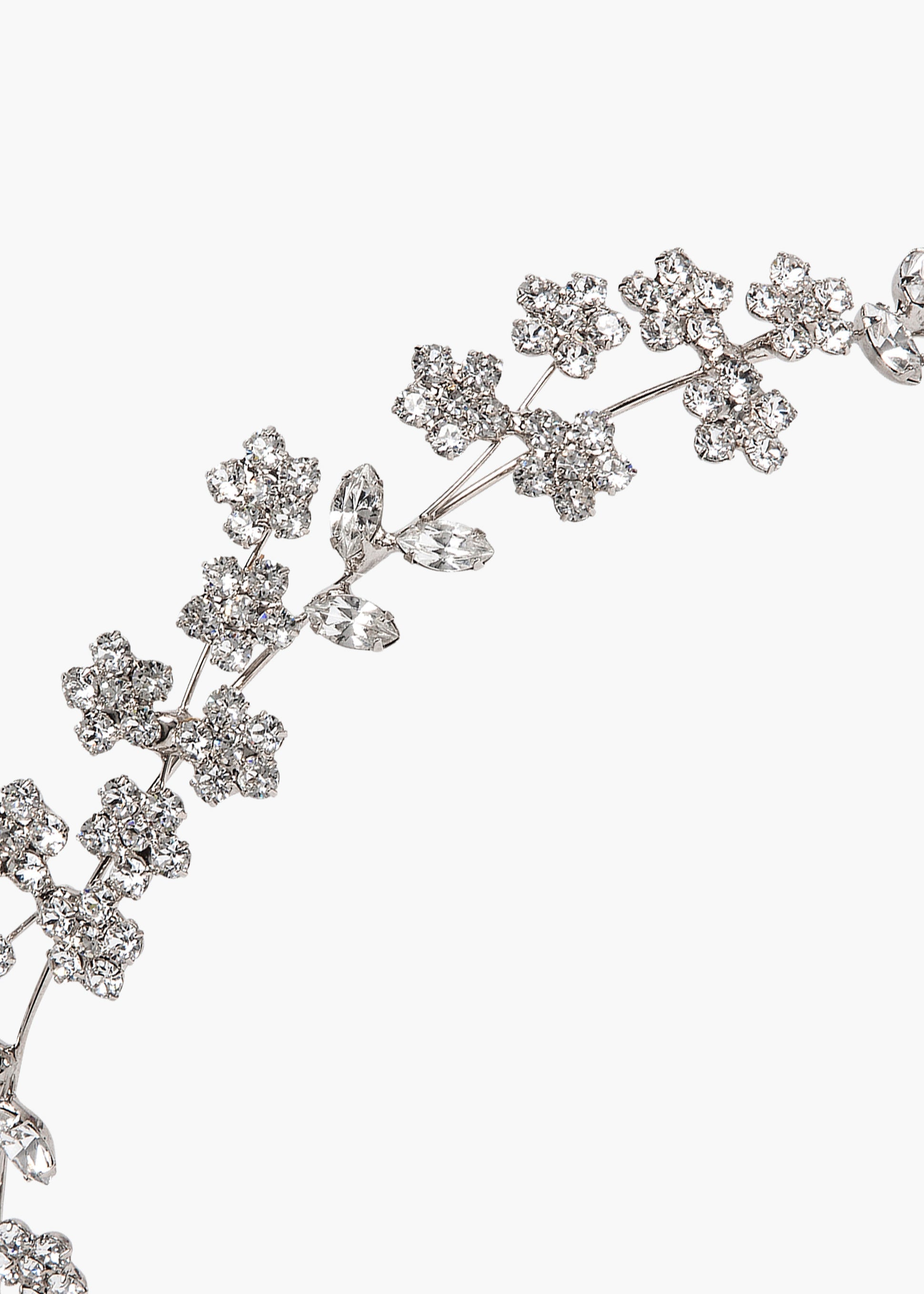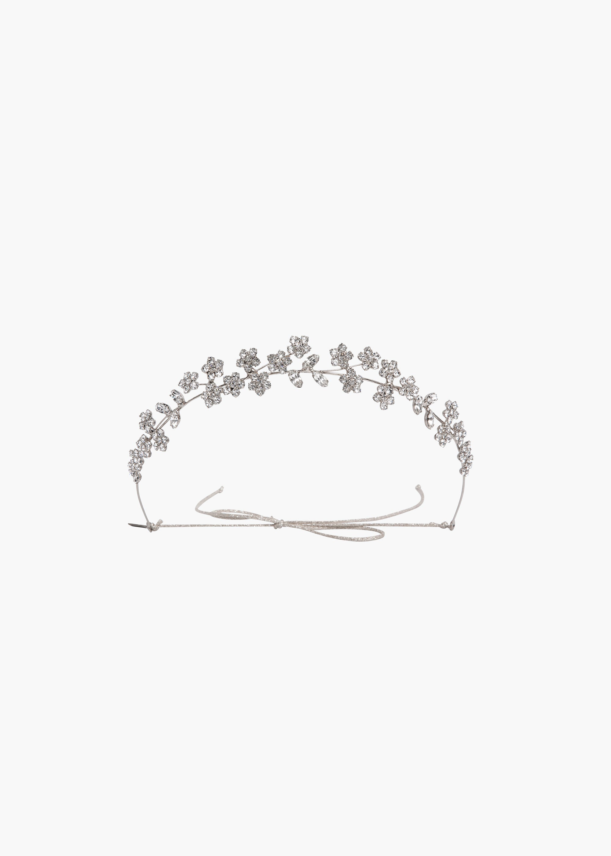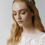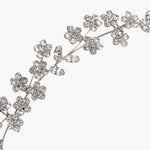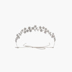 The Adelie Circlet provides a tiara-like twist on a classic circlet, as it has a bit of height, yet is still easy to wear. This romantic headpiece features dozens upon dozens of Swarovski crystals assuming the shapes of flowers and leaves; each stone is set by hand in a time-consuming process that ensures regal sparkle. This circlet is finished with a removable ribbon tie back, and can be worn at the crown of the head, or in the back of the hair. Pair with the matching Violet Stud Earrings. Dimensions: 2.75 x 4.75 x 7 inches Weight: 35g