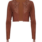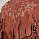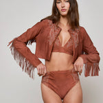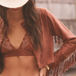This swim cover-up cardigan brings Western flair to the beach, featuring a suede-look finish, embroidered detailing, and fringed trims.