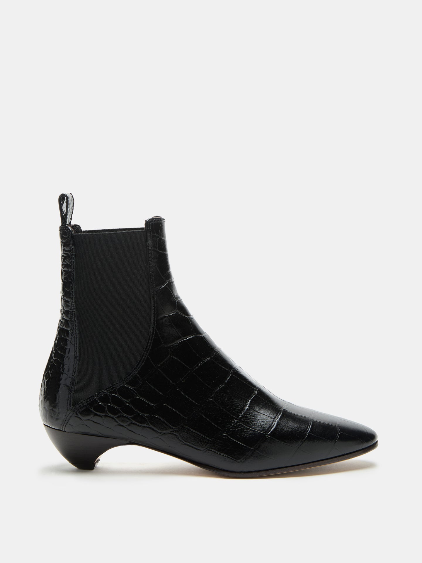 Allegra Chelsea Boot, handcrafted in coco black croc embossed calf leather, with a cushioned calf leather insole and zip fastening. 40mm heel. Made in Italy.