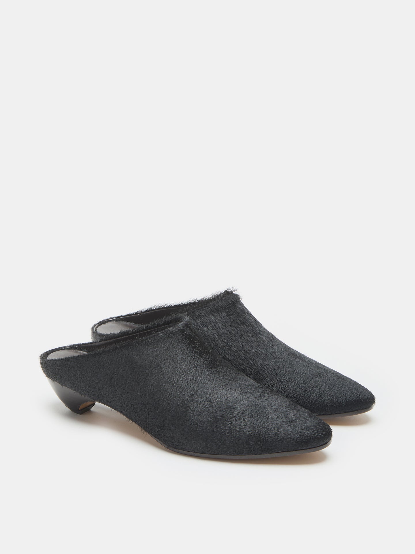 Allegra Mule, handcrafted in black calf hair, with a cushioned calf leather insole and a 35mm heel. Slip on. Made in Italy.
