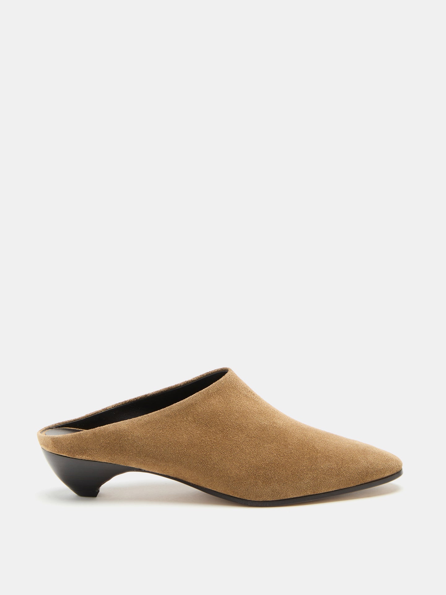 Allegra Mule, handcrafted in taupe suede, with a cushioned calf leather insole and a 35mm heel. Slip on. Made in Italy.