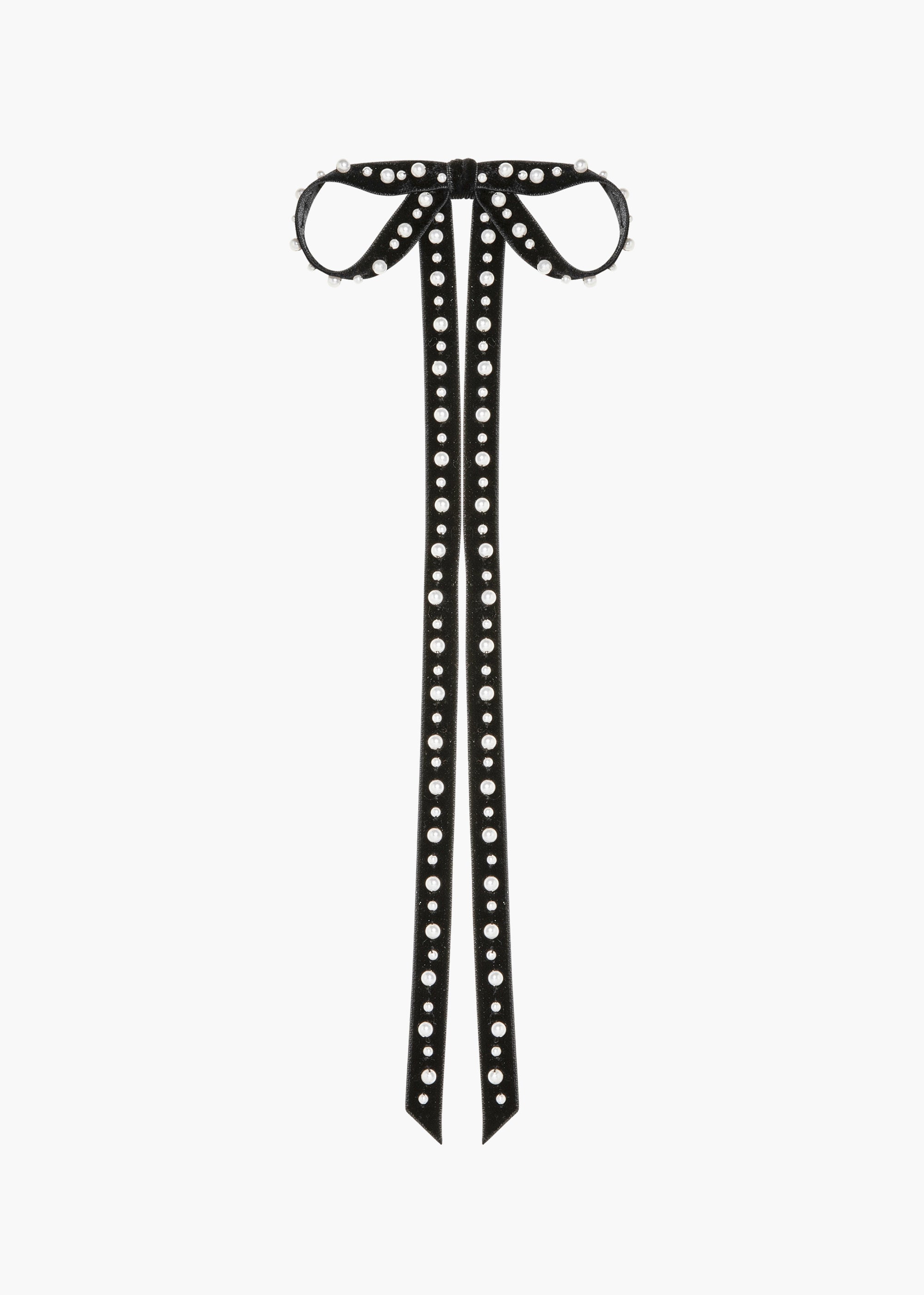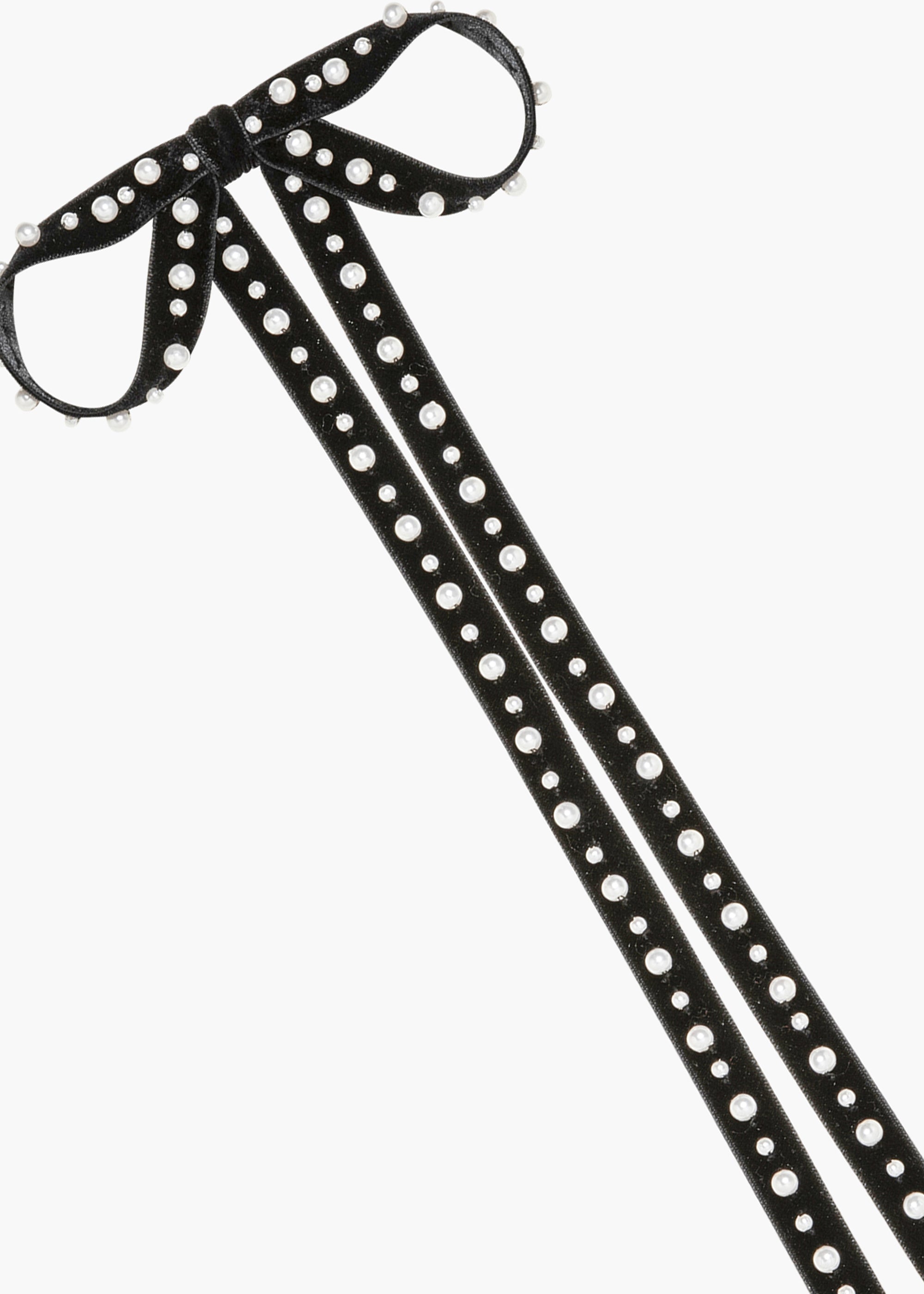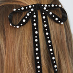 The Annalee Bow Barrette has a distinctly whimsical appeal, featuring embroidered pearls in a playfully exaggerated bow. Crafted from silk velvet, the bow's extra-long tails ripple through the hair like streamers. The bow is finished with an automatic French barrette closure, for easy placement in any style. Dimensions: 5.5 inch width, 14 inch length