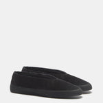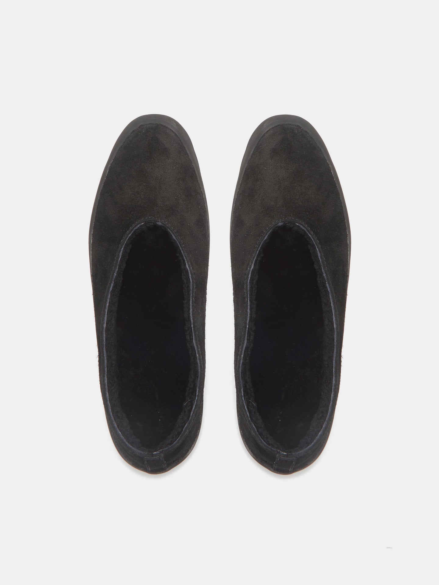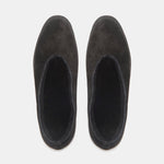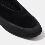 Black Suede Apres Ski Shearling Flats. Cushioned insole with tonal shearling lining, tread in smooth rubber. 8mm heel. Made in Italy.