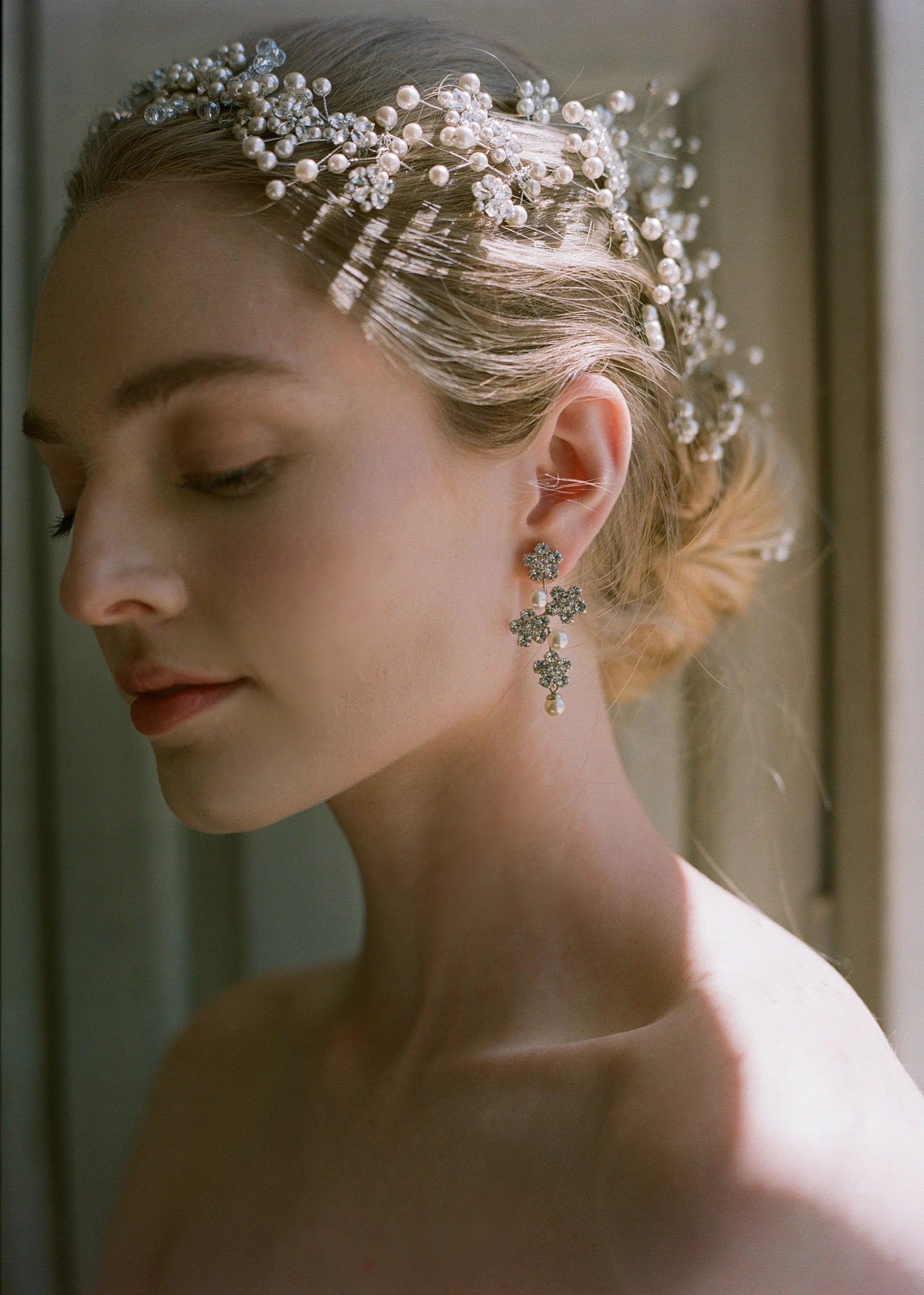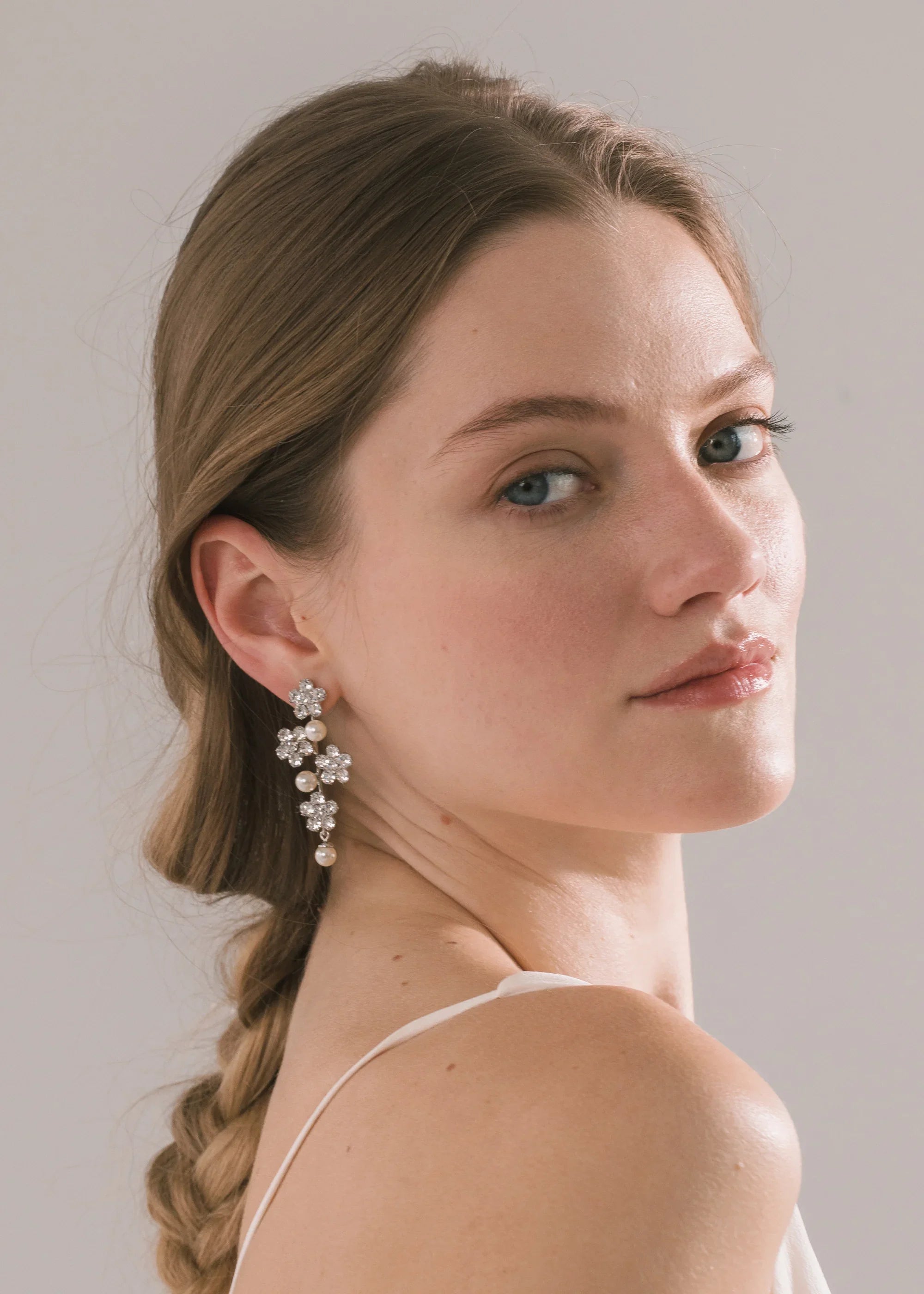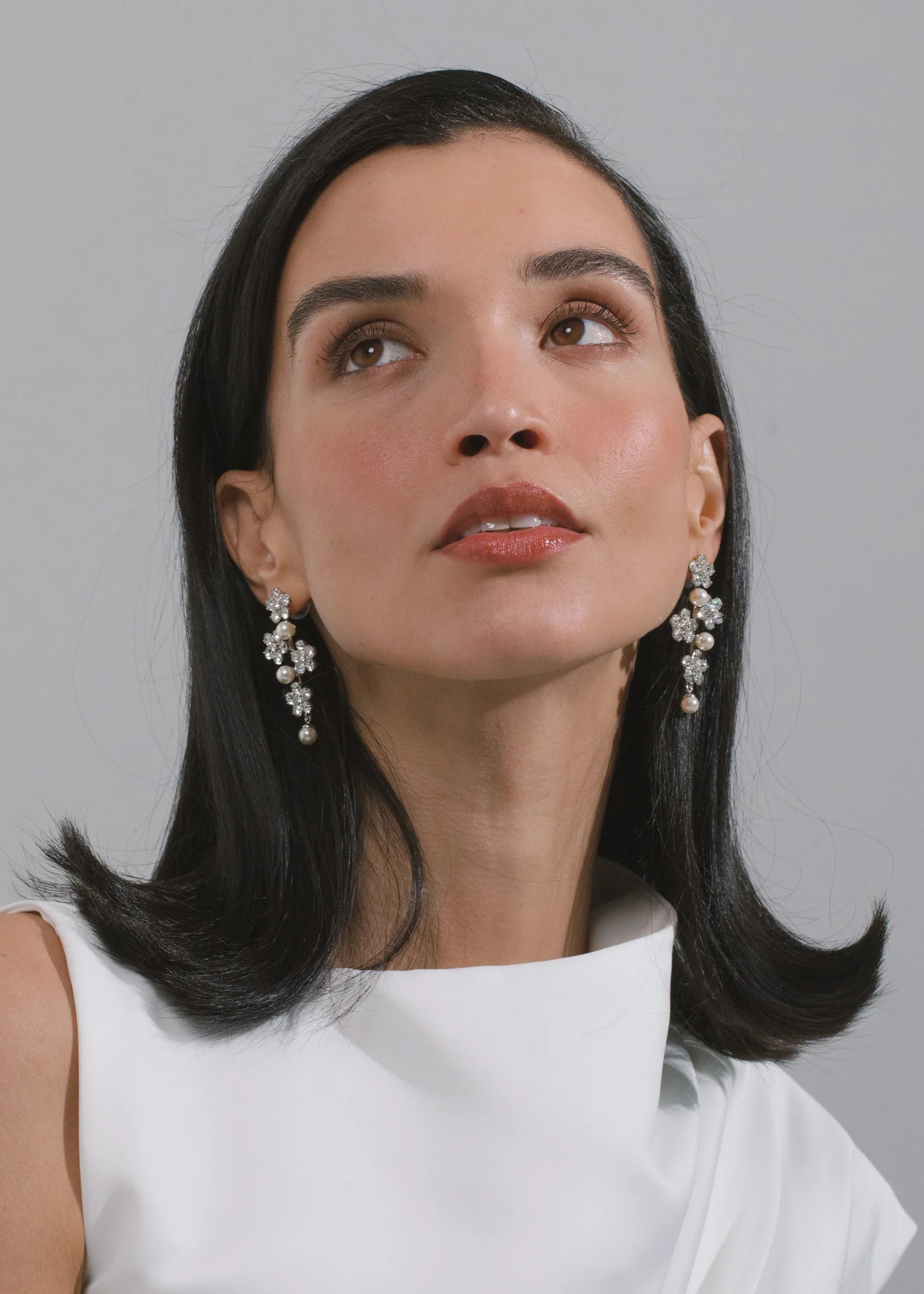 The Aria Earring gives you the best of both worlds: the sparkle of crystal flowers mixed with classic crystal pearl elements. Made by hand in New York City.