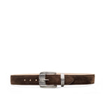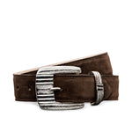 Subtle Western-inspired engravings on a silver-plated buckle add texture to this classic suede belt. Now in chocolate brown.