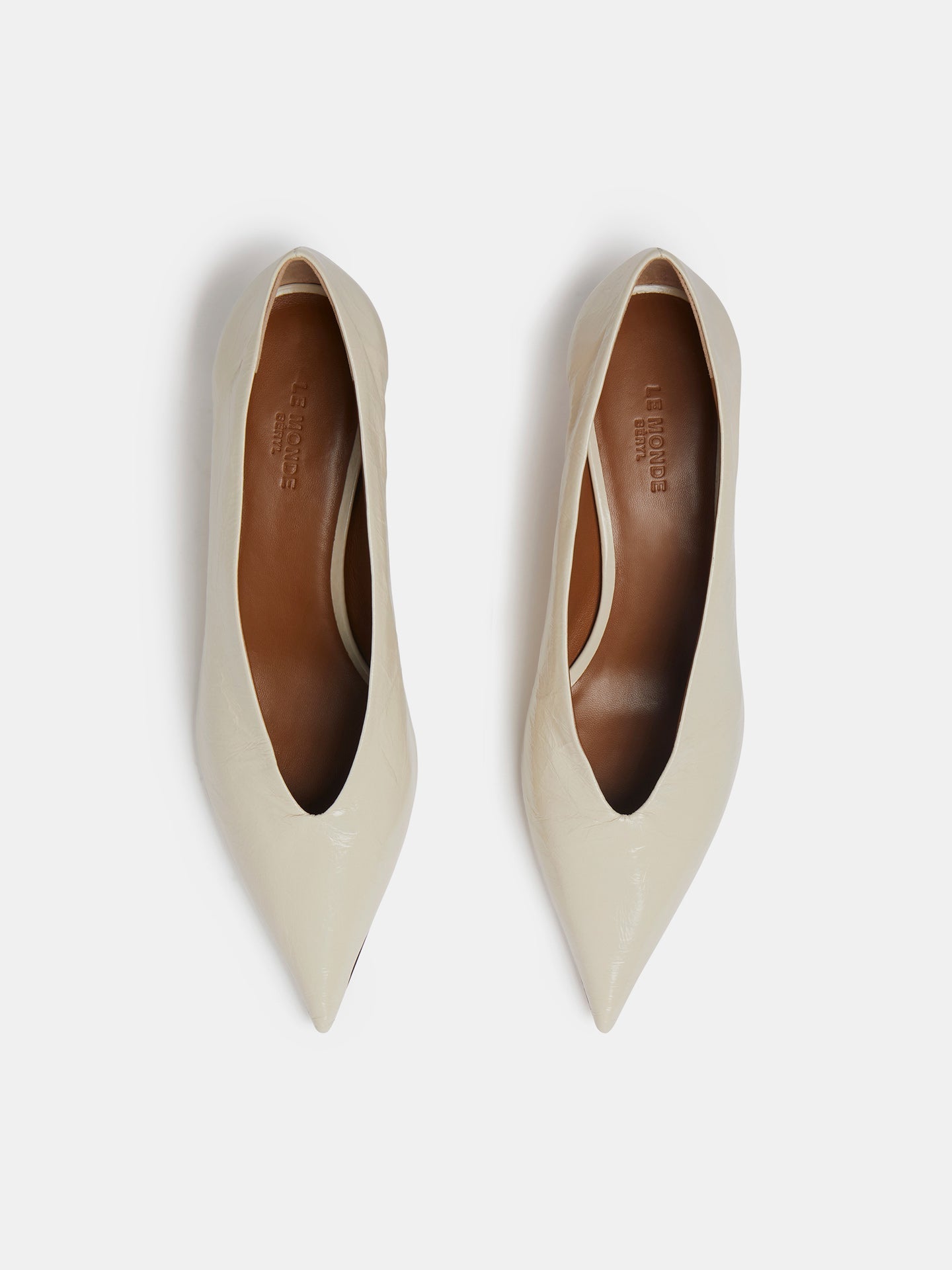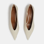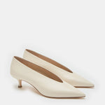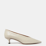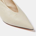 Babouche Kitten Heel in ecru naplack leather with a pointy toe and cushioned calf leather insole. 40mm heel. Made in Italy.