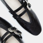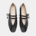 Ballet Claudia Slipper, handcrafted in black naplack leather, with two adjustable straps, western buckles, a cushioned calf leather insole and leather piping. 8mm heel. Made in Italy.