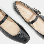 Ballet Mary Jane, handcrafted in black naplack leather with buckle-fastening, a cushioned calf leather insole and leather piping. 10mm heel. Made in Italy.