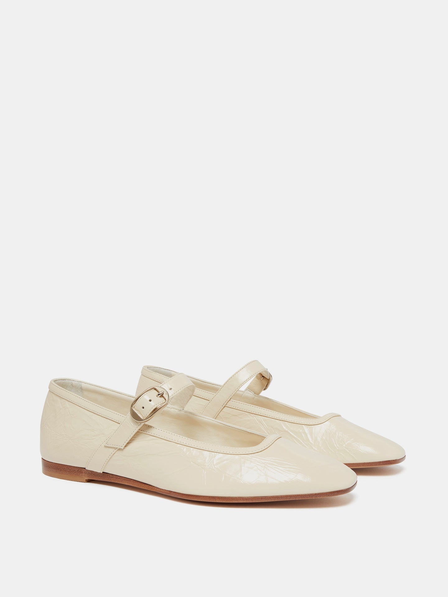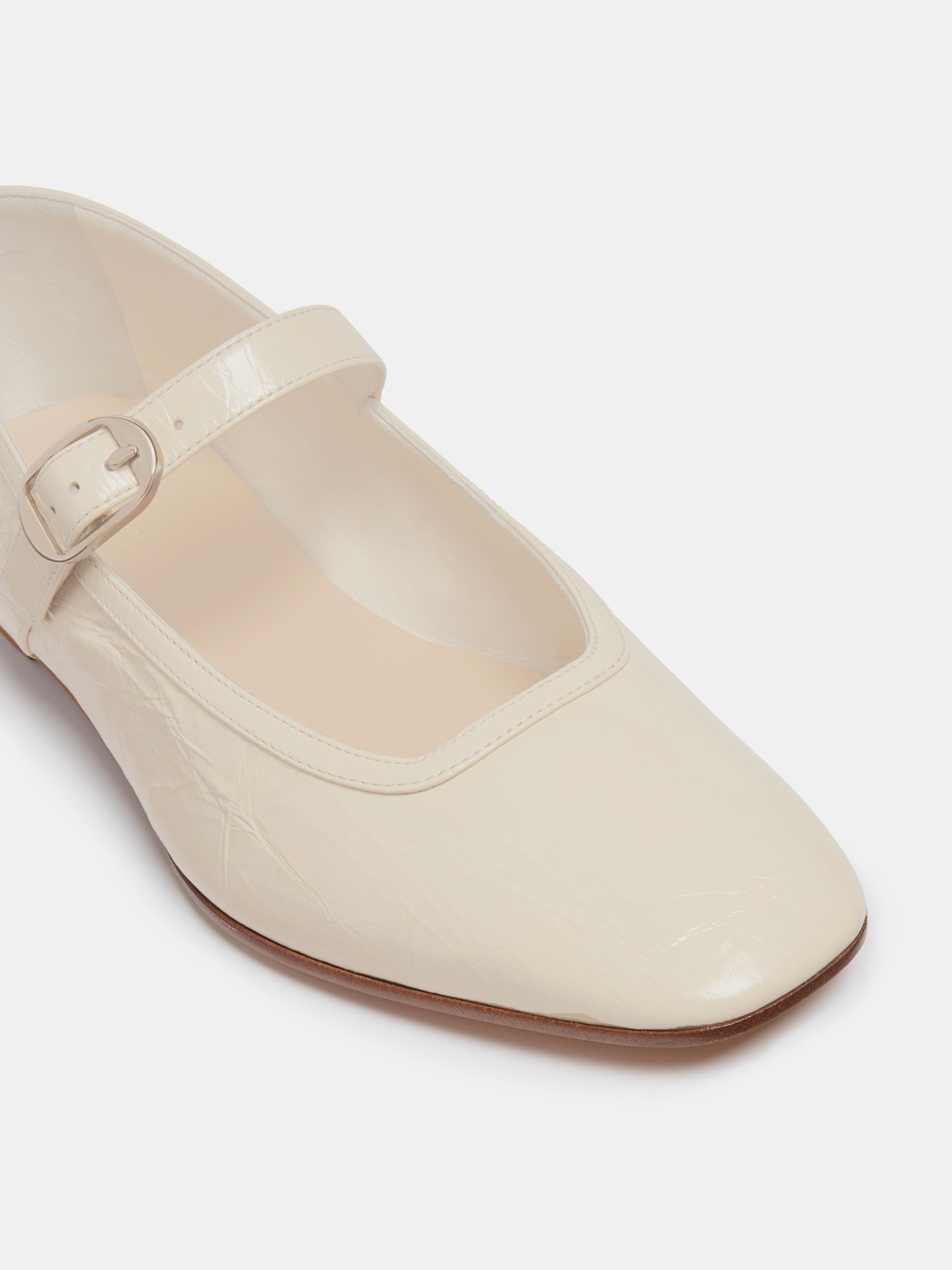 Ballet Mary Jane, handcrafted in ecru naplack leather, with buckle-fastening, a cushioned calf leather insole and leather piping. 10mm heel. Made in Italy.