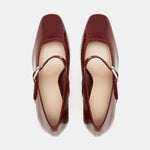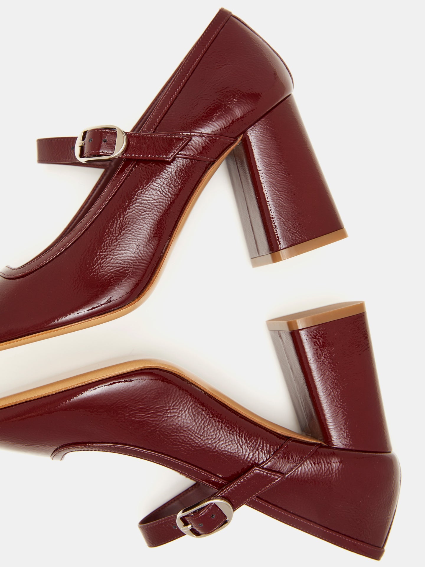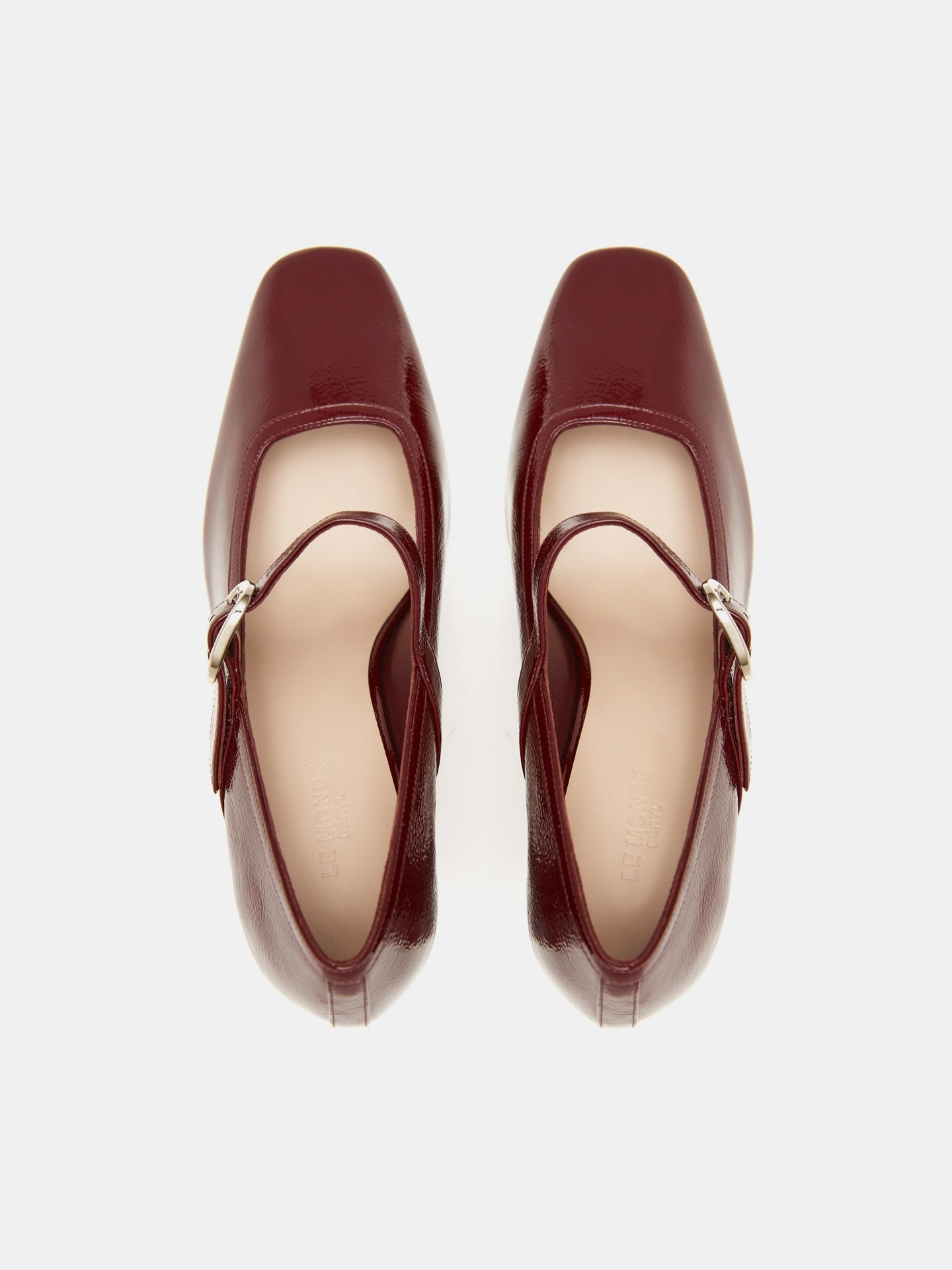 Ballet Mary Jane Pumps in oxblood patent leather with buckle-fastening, a cushioned calf leather insole and leather piping. 80mm heel. Made in Italy.