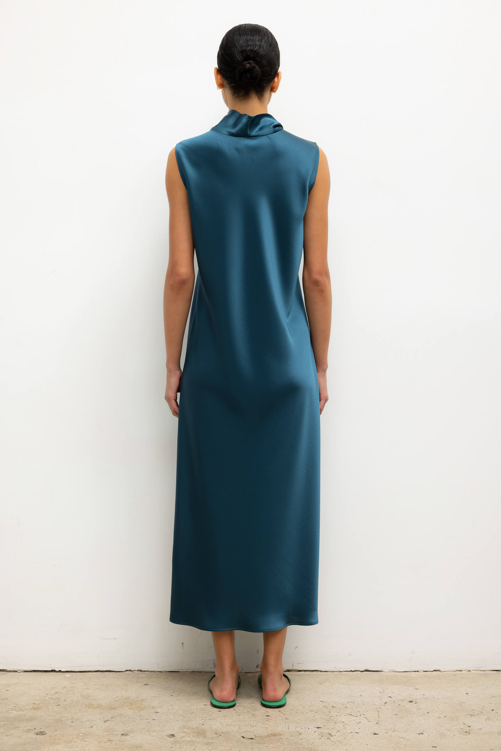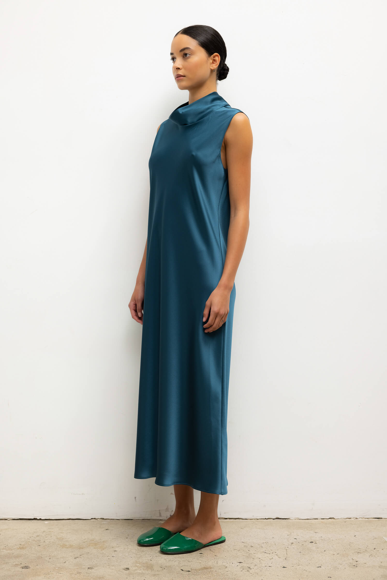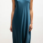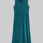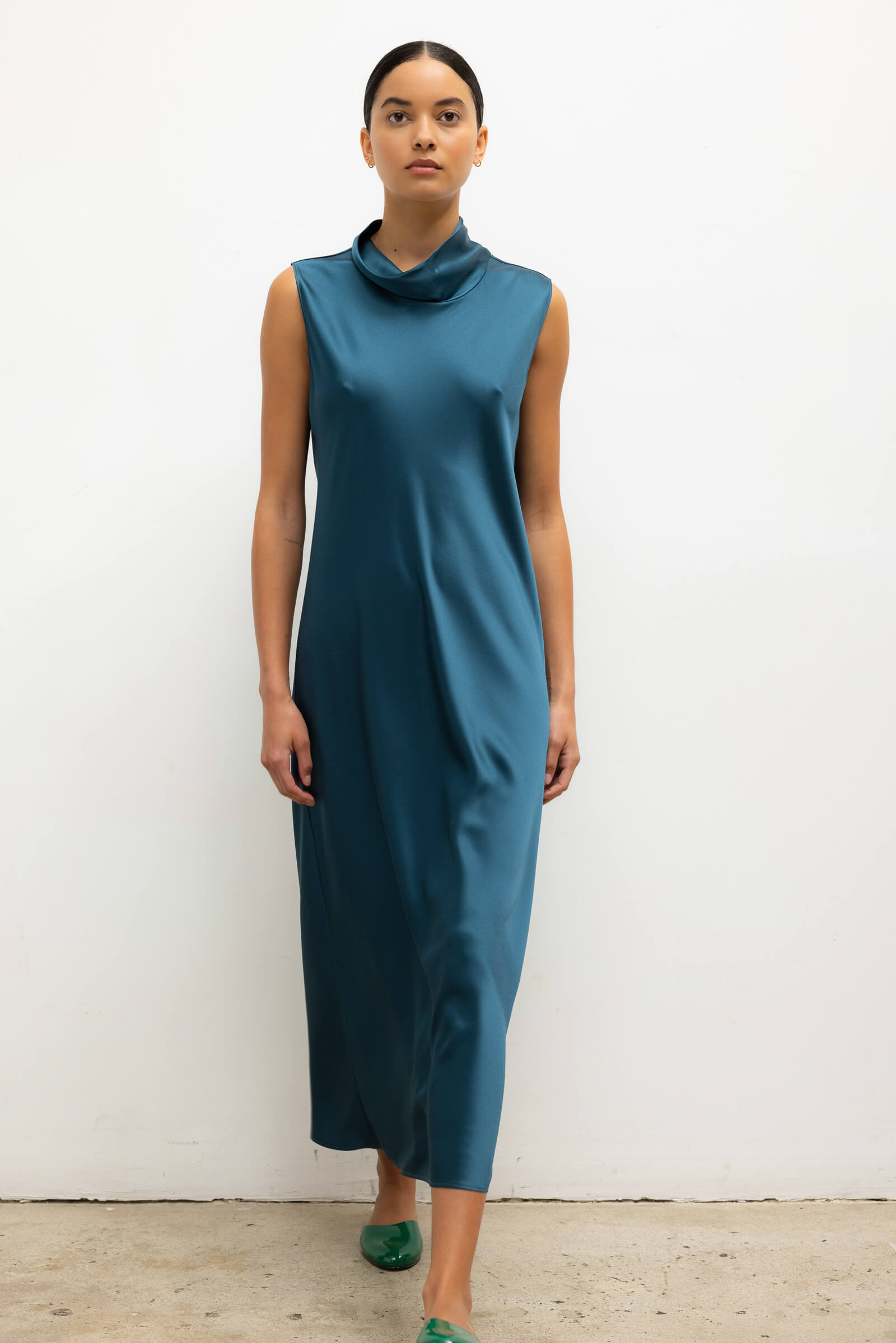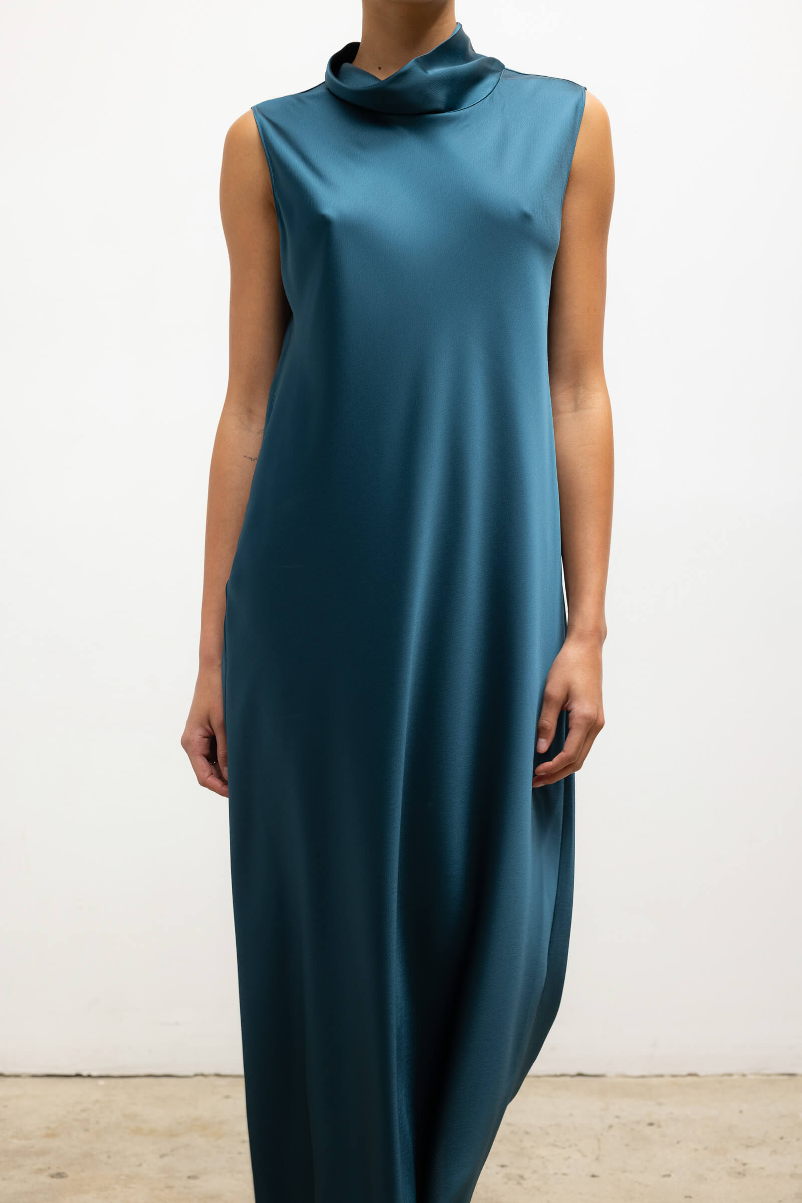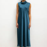 Cut in our best-selling, Japanese-crafted Barb Satin, The Barb Mock Neck Sleeveless Dress is a midi length dress, featuring a perfectly draped mock neck and sleeveless silhouette. Wear it by itself or layered over The Barb Wide Leg Pant.