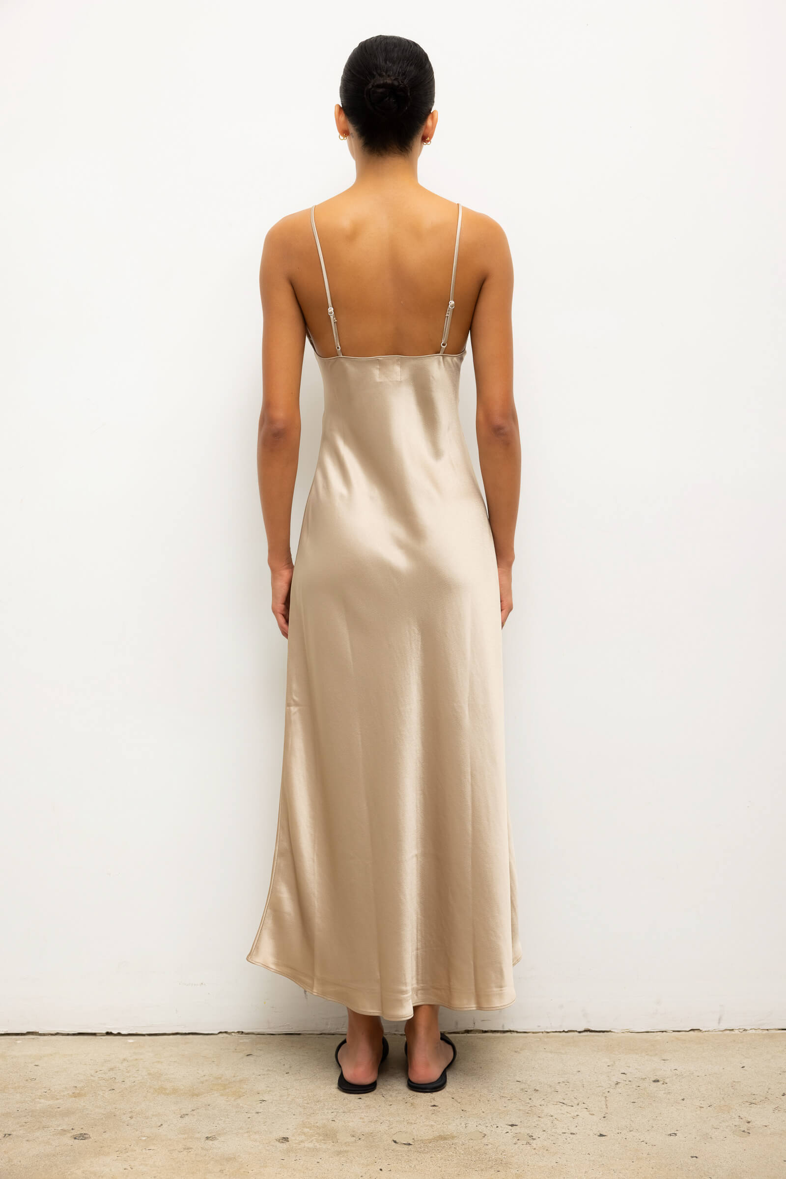Cut in our best-selling, Japanese-crafted Barb Satin, The Barb Slip Dress is a dramatic maxi silhouette, featuring an open back, adjustable thin straps, and a deep V neckline.