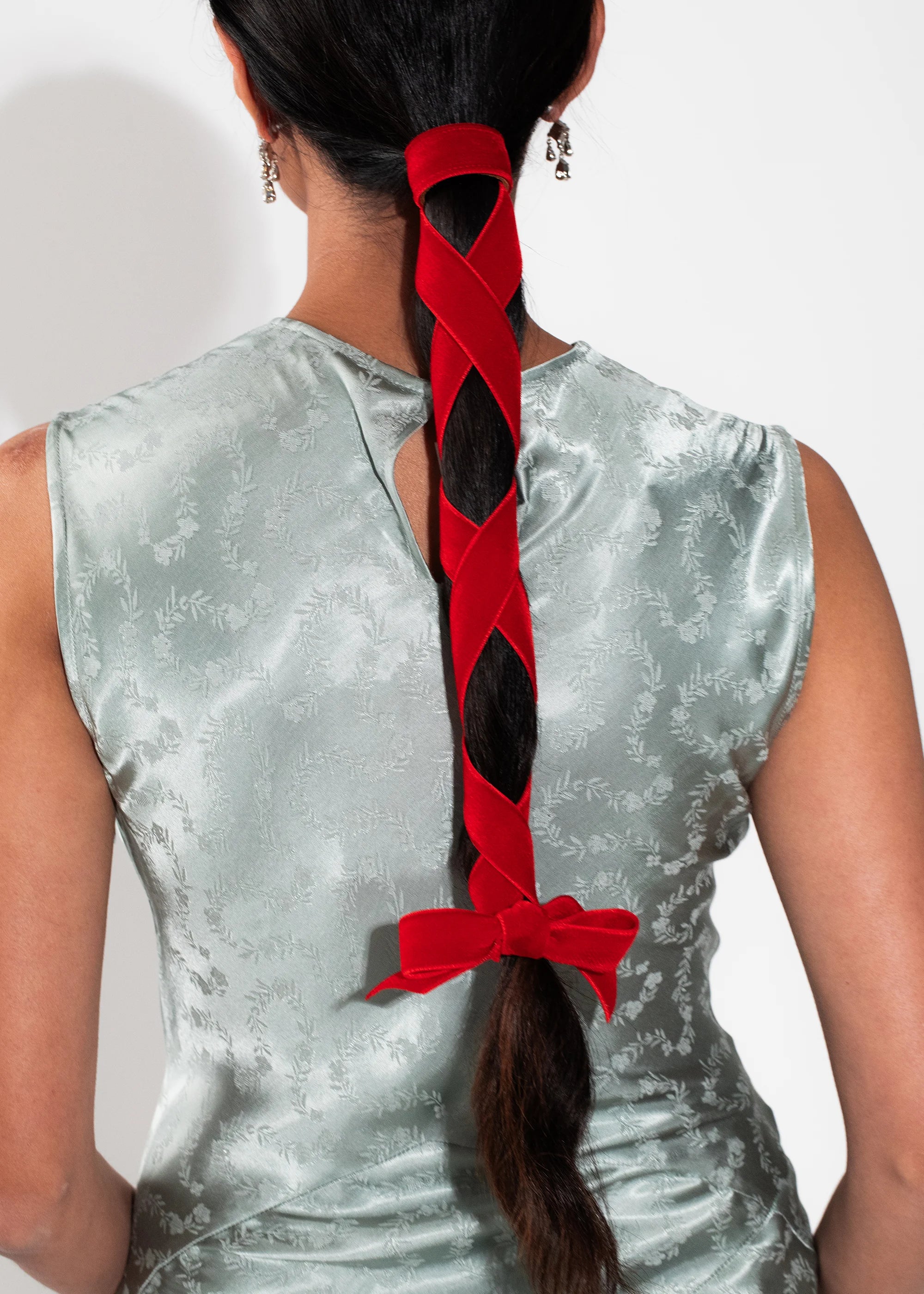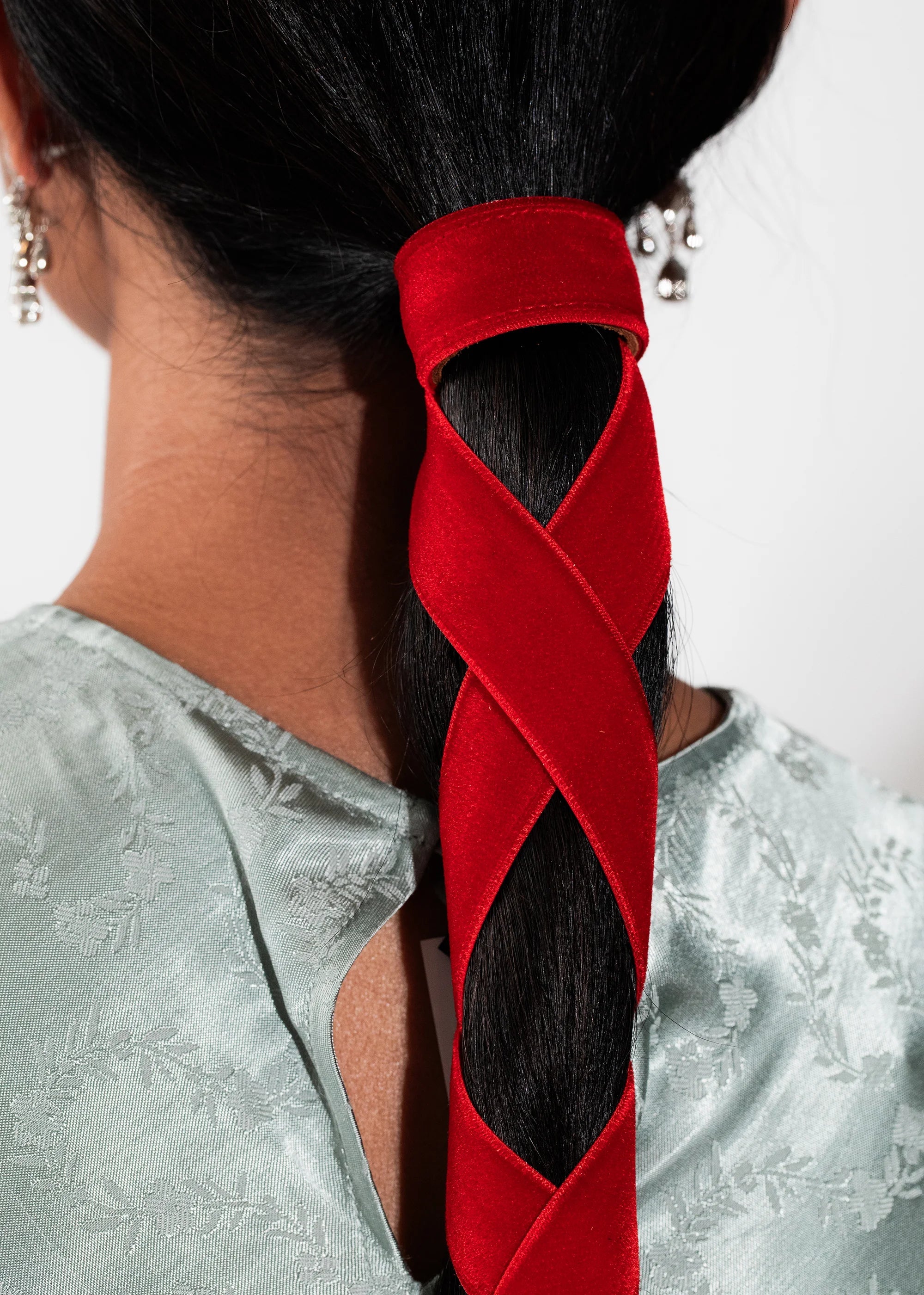 The Belle Velvet Ribbon Ponywrap is our dressed up take on our bestselling ponywrap silhouette. The long velvet ribbons create endless opportunities for styling, from tying in a bow to wrapping within a braid, the options are endless. Each one is made by hand in New York of silk velvet, with a bendable wire interior, making it possible to perfectly curve it around your ponytail, no matter its thickness. It is finished with a Japanese elastic, specifically selected for its strength and stretch. Dimensions: 3/4in x 5in