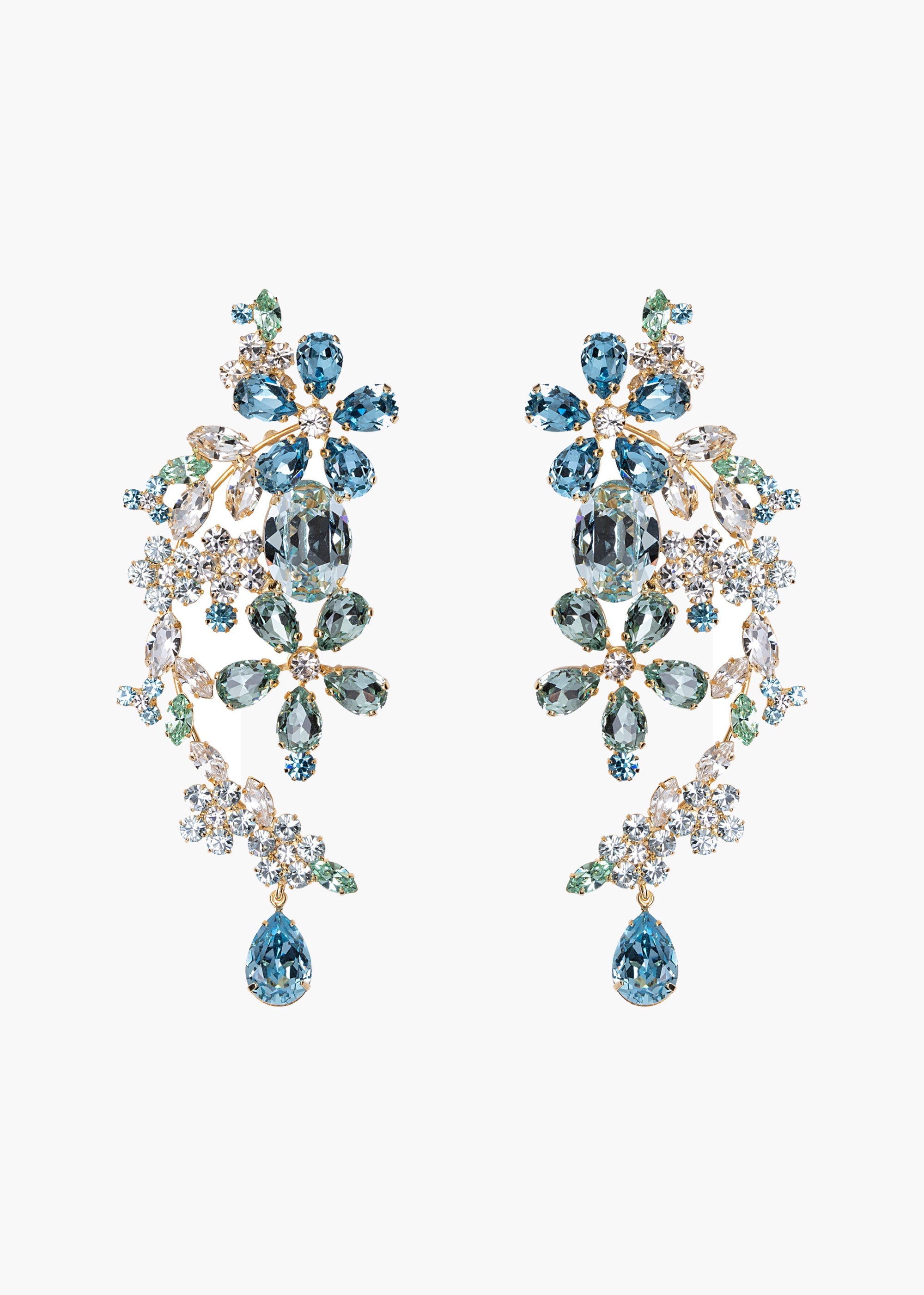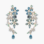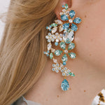 A wearable masterpiece, the Bellemy Earrings are designed to mimic an actual bouquet, with exquisite variety and balance. Crafted by hand in New York, the flowers are individually designed with fine crystal stones, together creating a harmonious palette that reflects the dimension of a real life garden. Lightweight for their size due to their hand-made construction, the subtle drops catch the light as they move. Dimensions: 4.25" length.