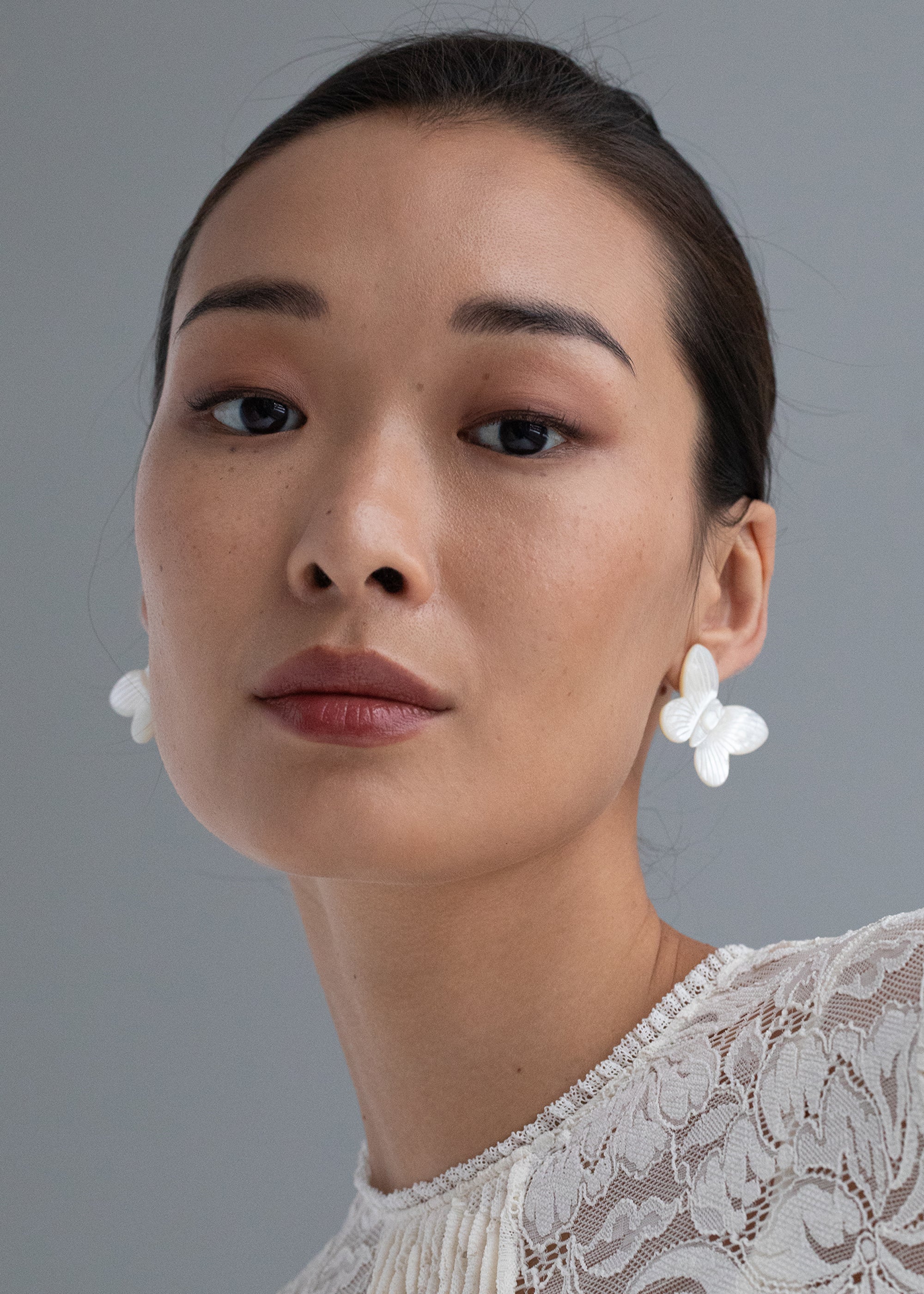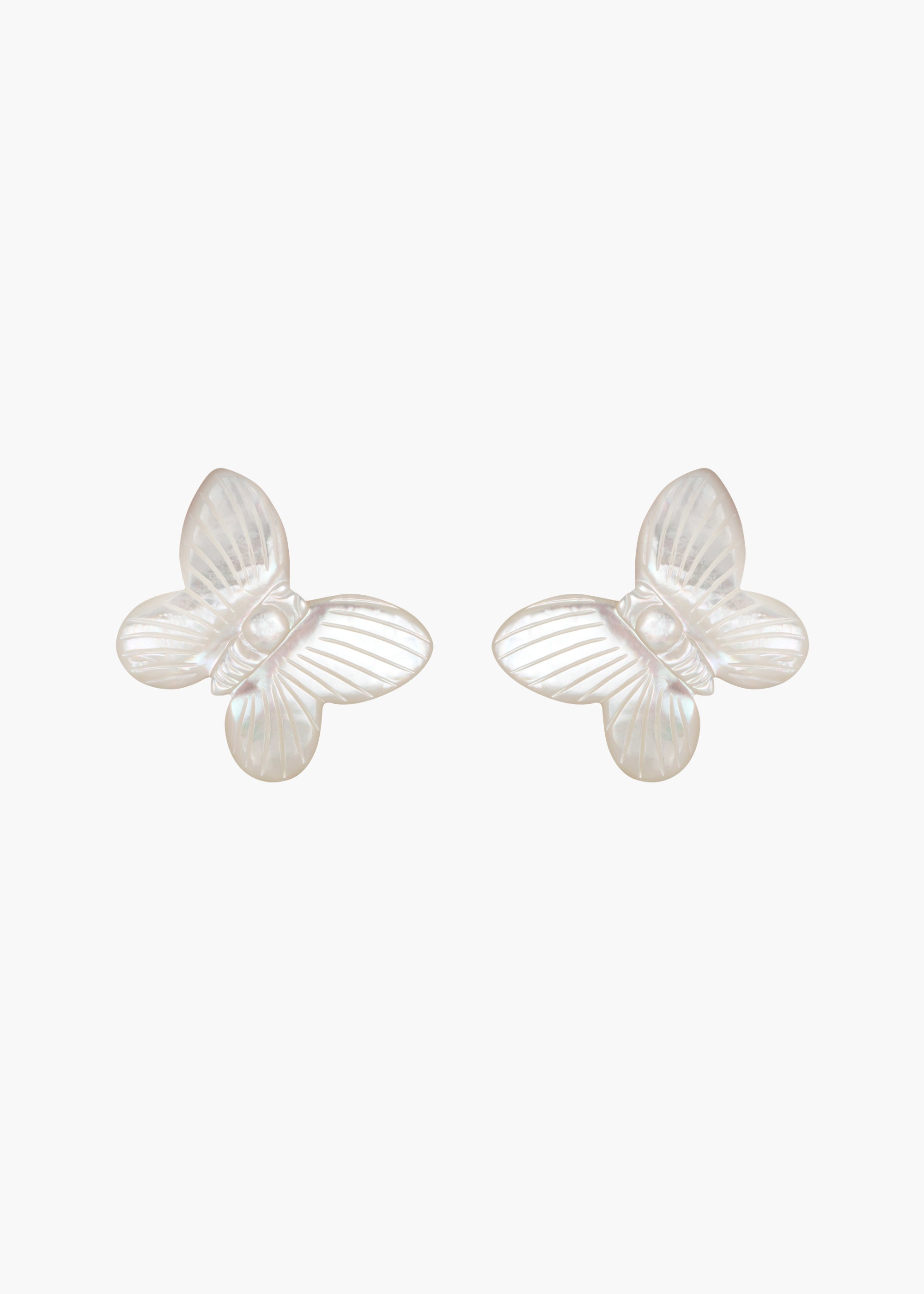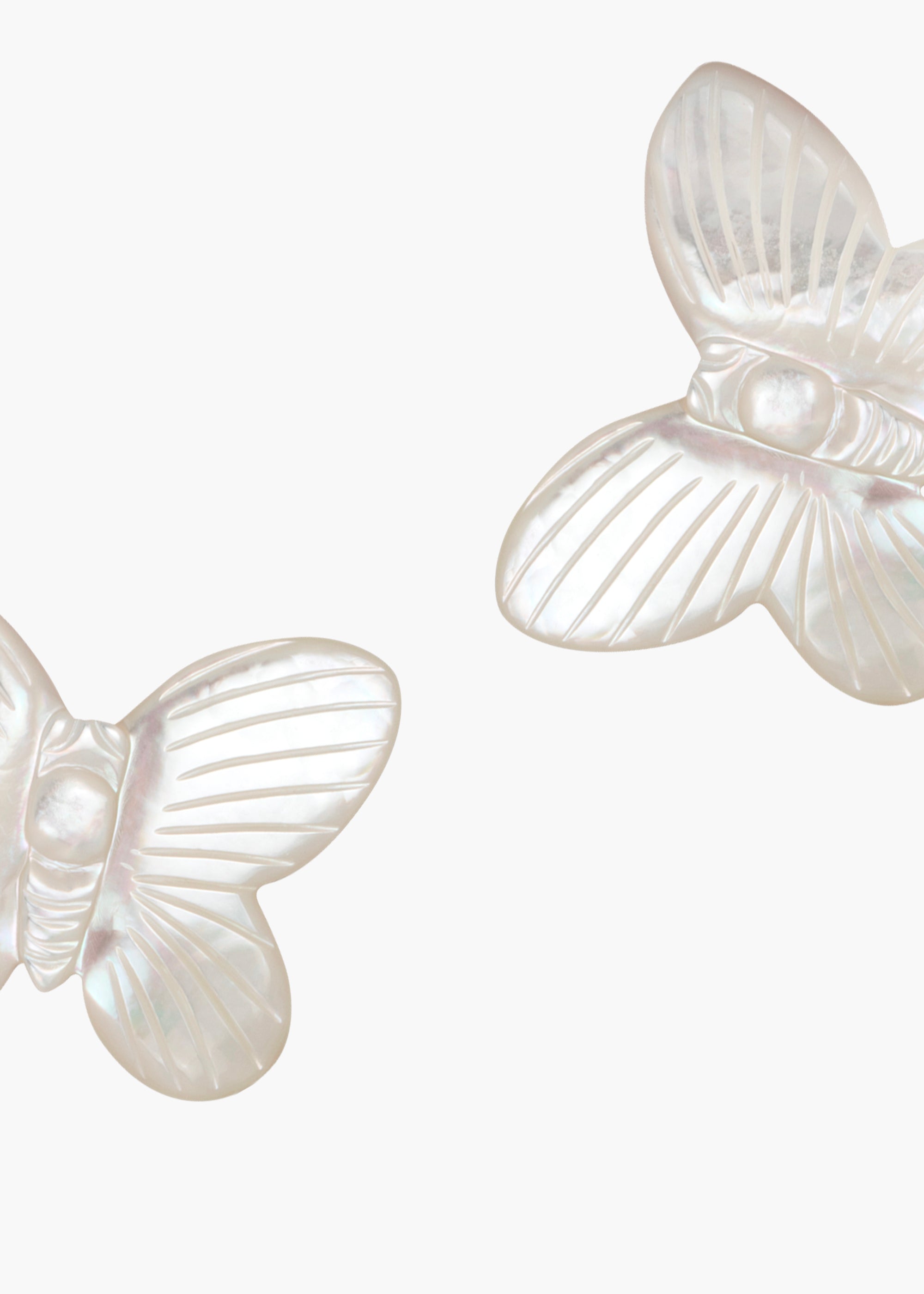 The Bree Earrings are a celebration of the butterfly: our adored emblem, an otherworldly harbinger of good fortune and rebirth. Stunning in their simplicity, these earrings allow the mother of pearl's beauty to sing. They are artfully angled to appear mid-flight, and etched with true-to-life details.