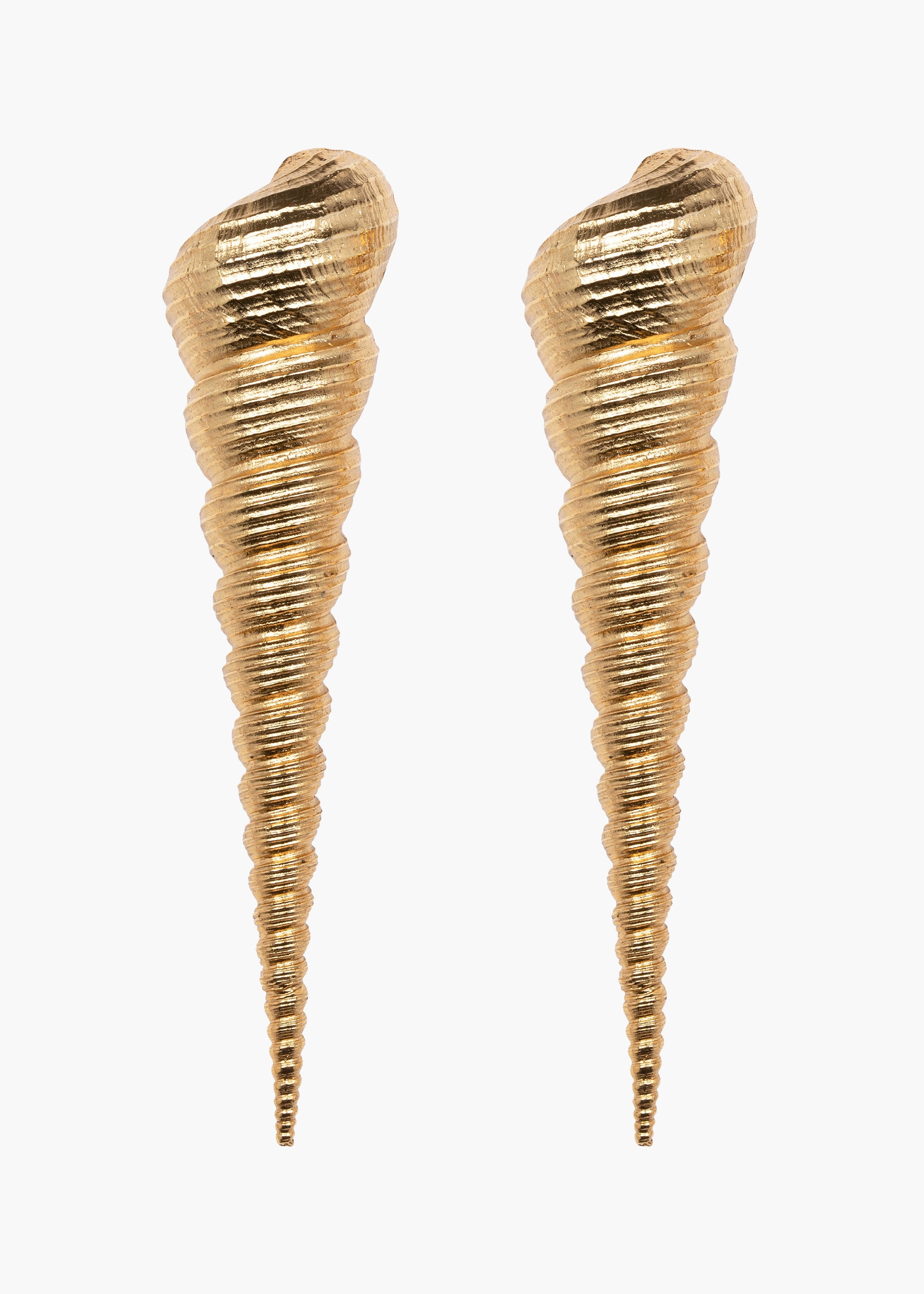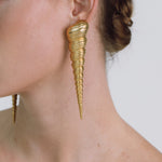 An absolutely memorable statement, the Bronte Earrings are a dramatic finishing touch that instantly conjures images of exotic destinations. Each one is made by hand in New York, forming auger shells— complete with the shoulder-grazing, true-to-life scale of actual seashells. Despite their attention-grabbing silhouette, their 18-karat gold-plated finish means they are surprisingly easy to wear. Dimensions: 4.5 inch length