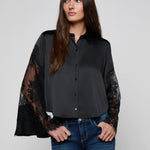 Our relaxed fit button-down shirt is back with a bohemian twist. Sheer lace bell sleeves add romance and drama to an otherwise classic silhouette. Style it with jeans for daytime and dress it up with sky-high heels and a maxi skirt for night.