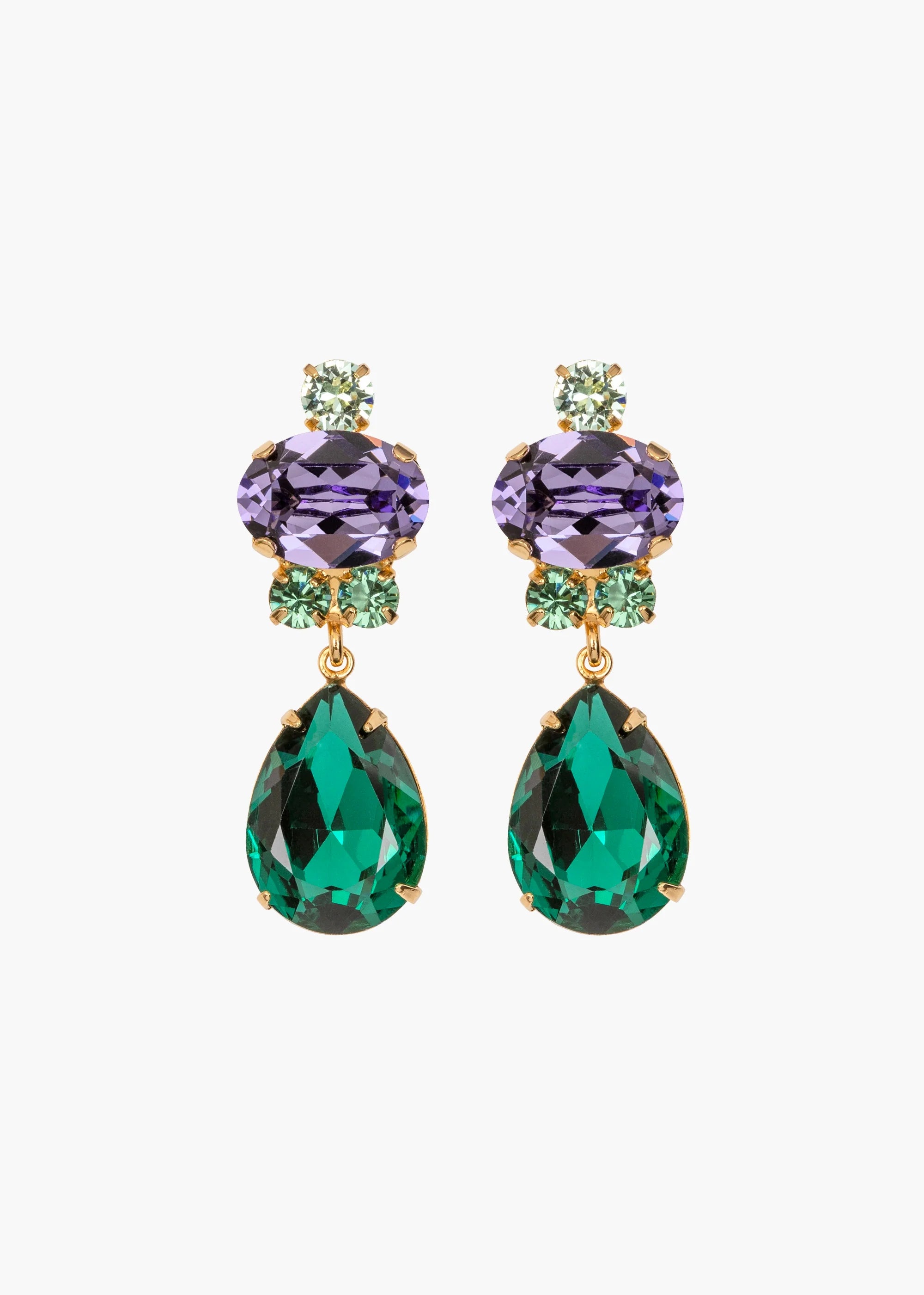 In a palette inspired by nostalgic vintage sweets, the Catherine Earrings are a chic drop to savor on repeat. Made by hand in New York, fine Austrian crystals in an interesting mix of cuts are positioned in an 18-karat gold-plated setting. The pear-cut drops offer movement, generating sparkle at every turn.