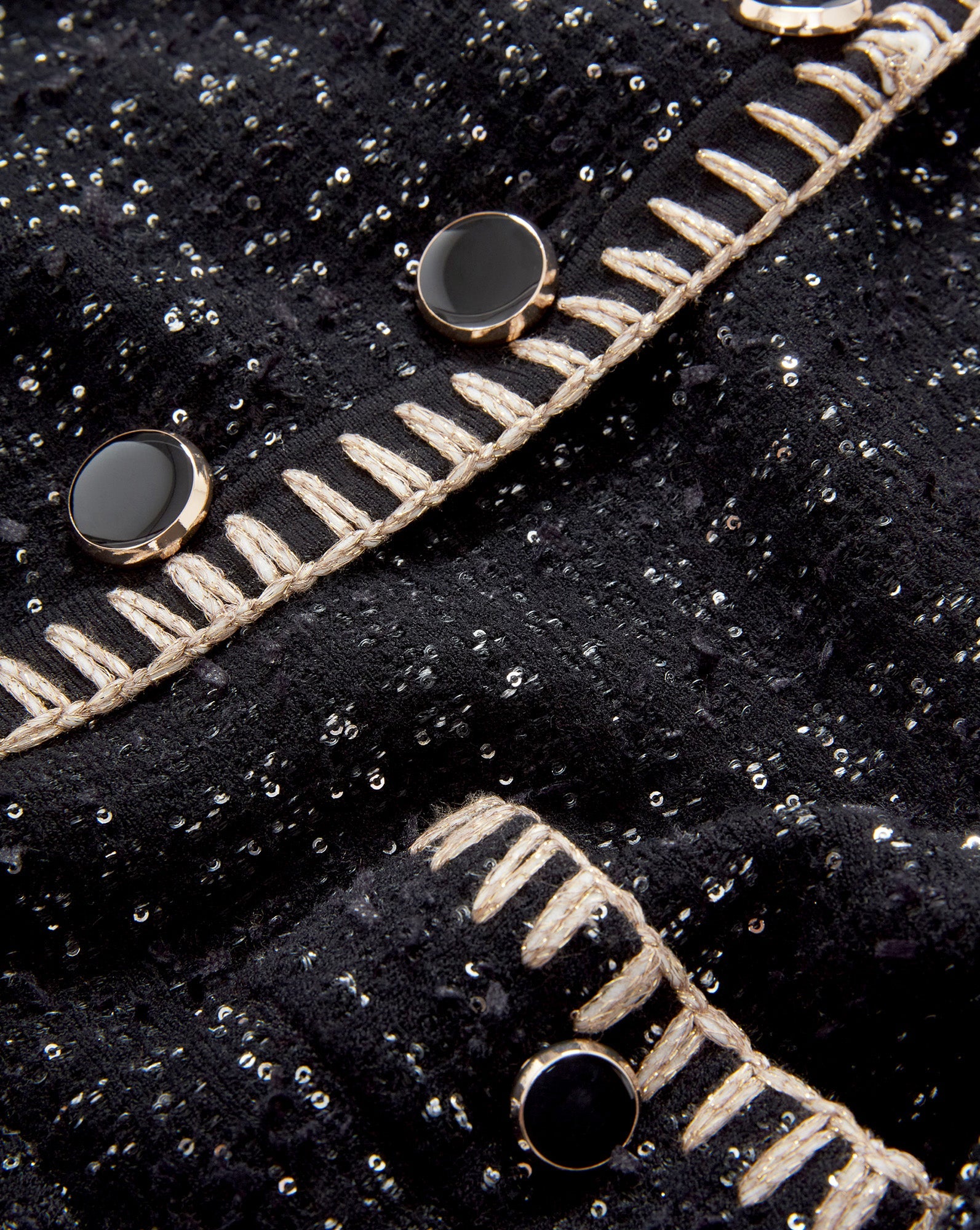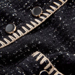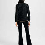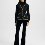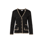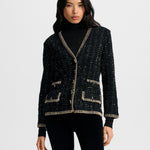 The ease of a cardigan, the polish of a jacket. Crafted from a black tweed knit, the Ceriani features a deep V-neckline, bezel-style buttons, flap pockets, and contrast metallic blanket stitching along the trim. Perfectly polished yet versatile, it pairs just as well with an LBD as it does with jeans.