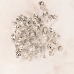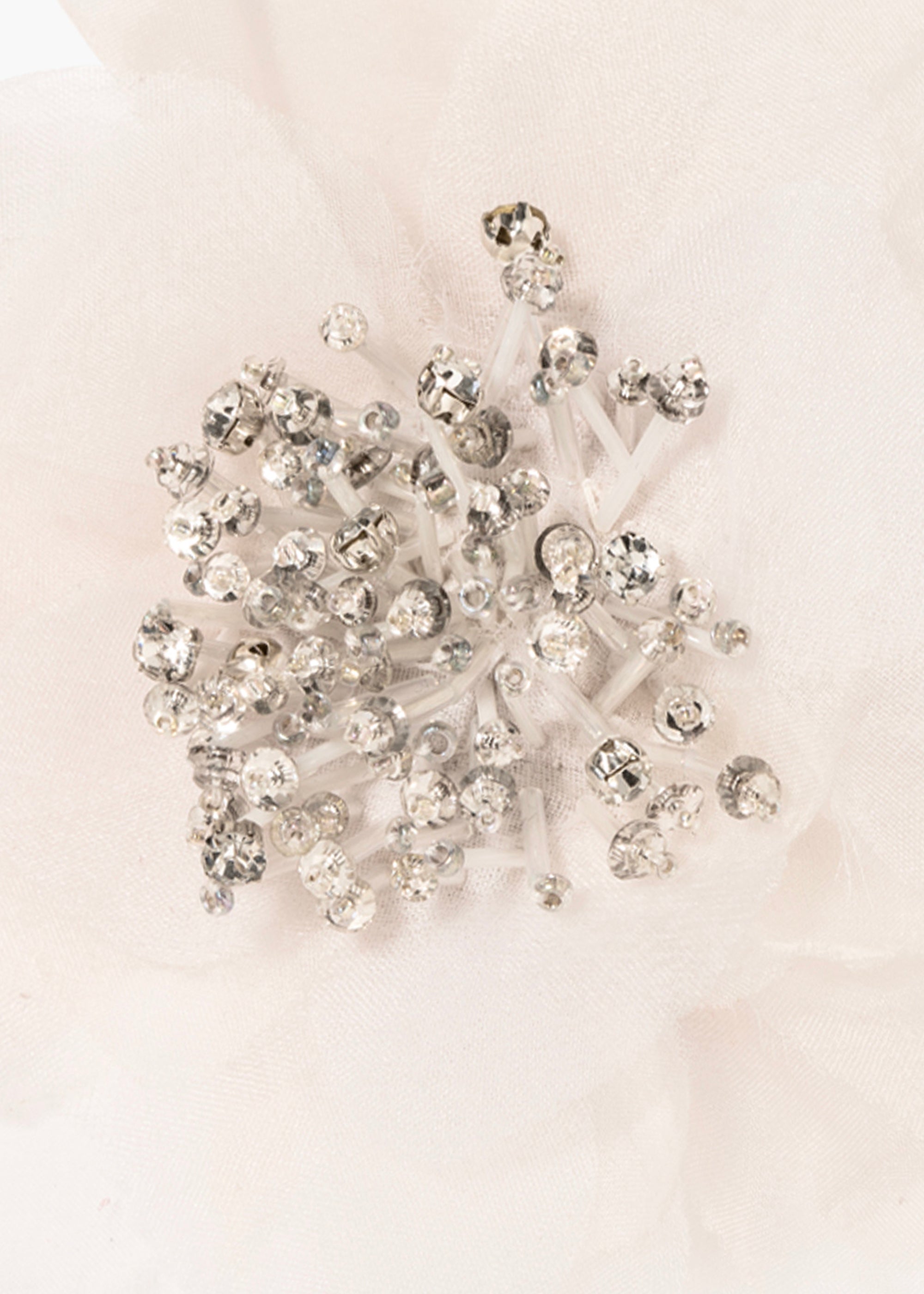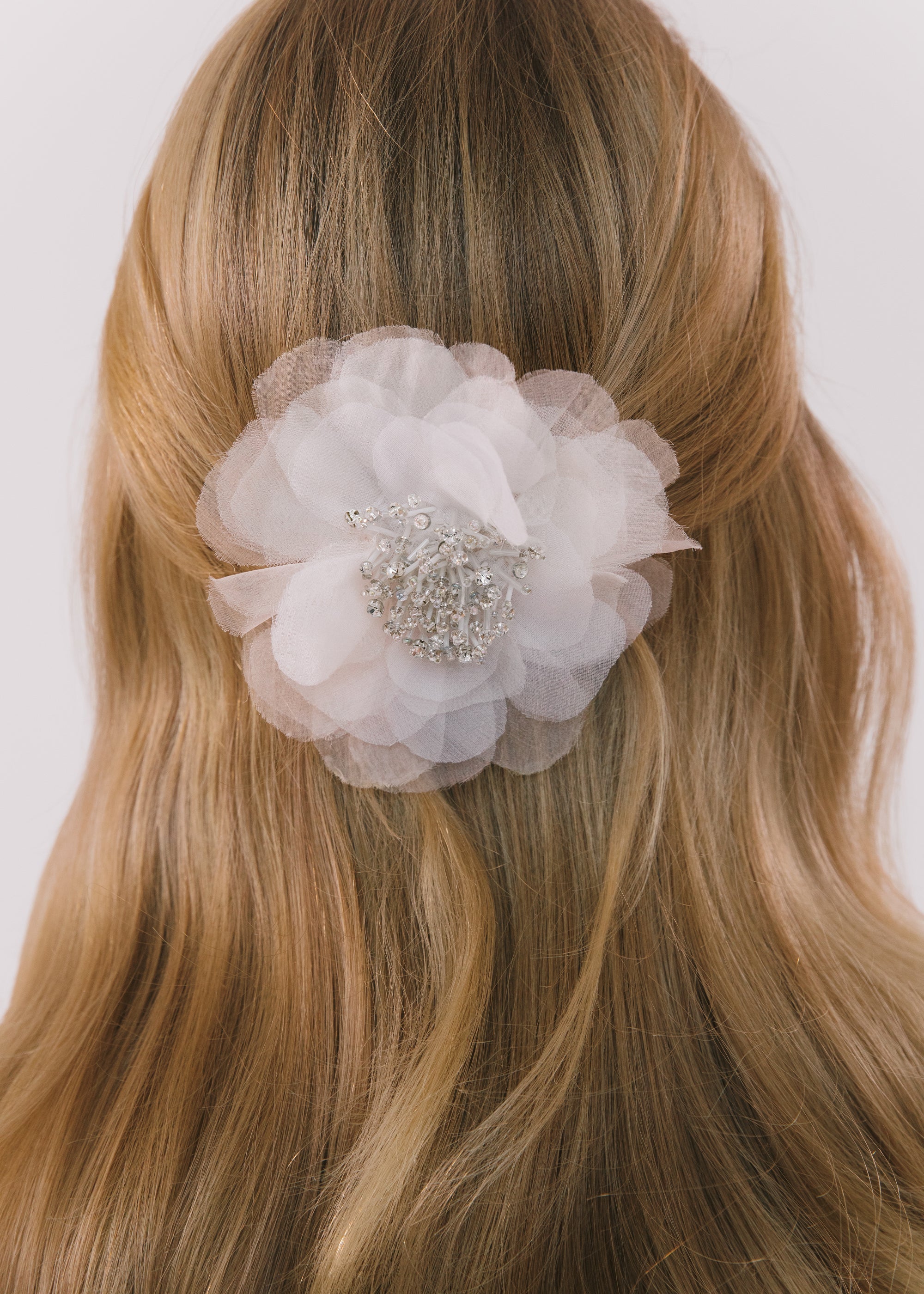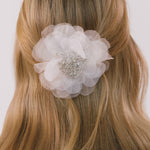 The Chantrell Barrette is a hand-crafted flower formed of individually hand-cut silk petals, complete with crystal stamen. The juxtaposition of the silk chiffon and organza petals, and the striking crystal details, allows this finishing touch to pair equally well with a diaphanous gown, or a heavily embellished look. Layer on the matching Chantrell Bobby Pin Set for a more dramatic look. Dimensions: 4.5" in length 4.5" in width, 2.5" in length.