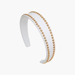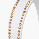 With supple lambskin leather and gold-toned stud details, the Chereen Headband is a classic way to elevate any look. Crafted by hand in a leather factory in Brooklyn, each stud is individually placed, using old leather techniques that are rarely seen today. It is grounded by a flexible headband base for comfortable wear. Dimensions: 1.25" width.