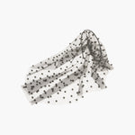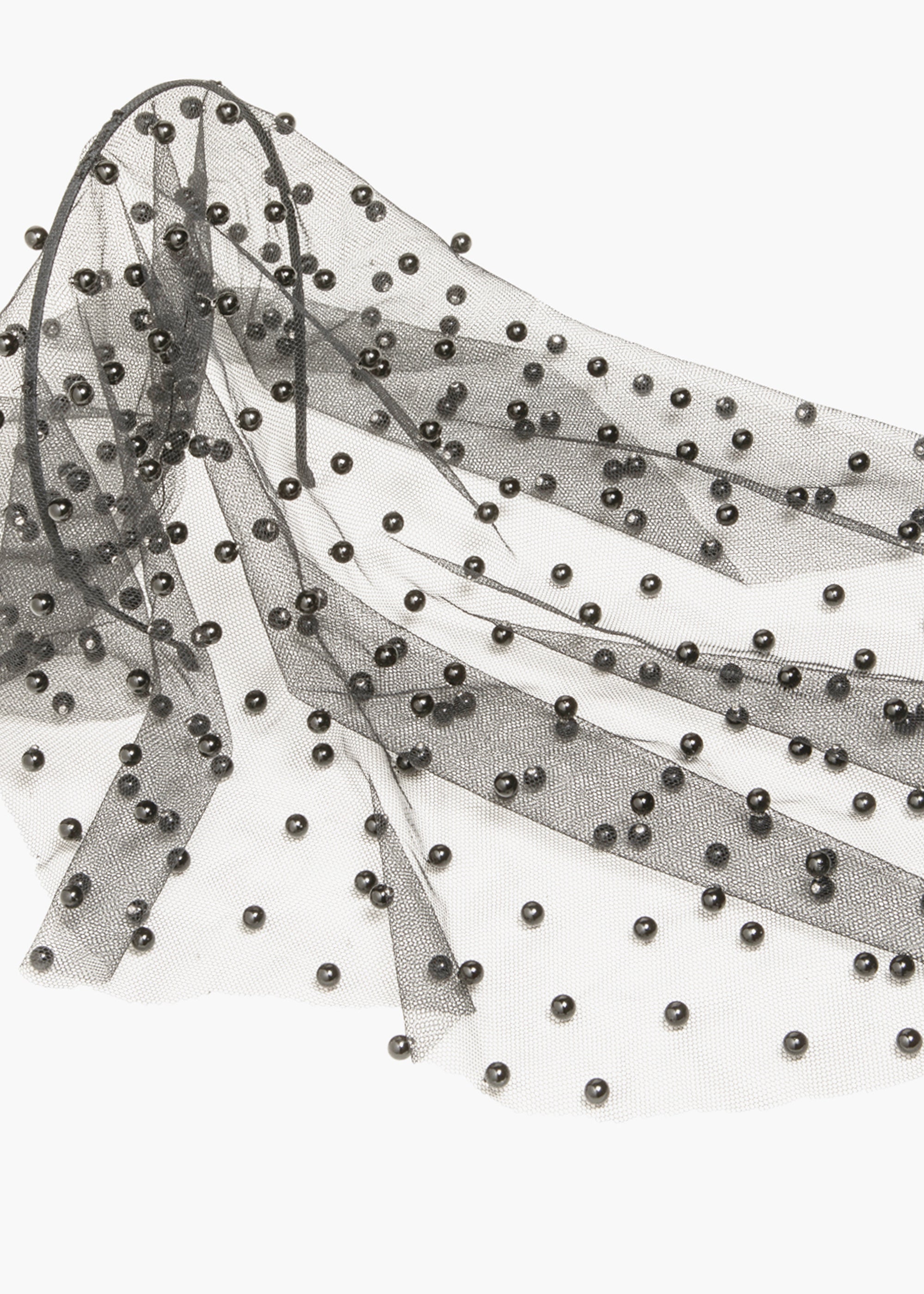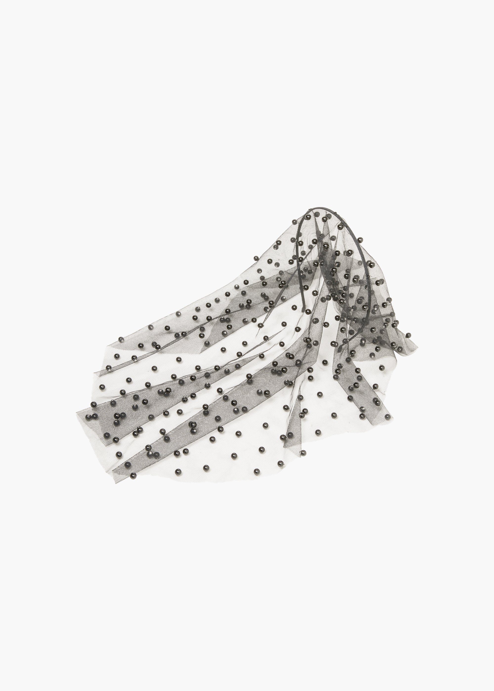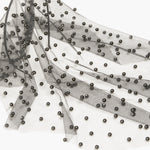 The Chiara Veil features shining pearls that are delicately hand-stitched to an ethereal mesh veil, enveloping the face in shimmering opulence. The placement of the peals creates a dramatic, obscured effect, offering a bold reinterpretation of the classic veil that blurs the line between seen and unseen, making every glance unforgettable.