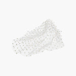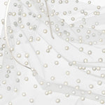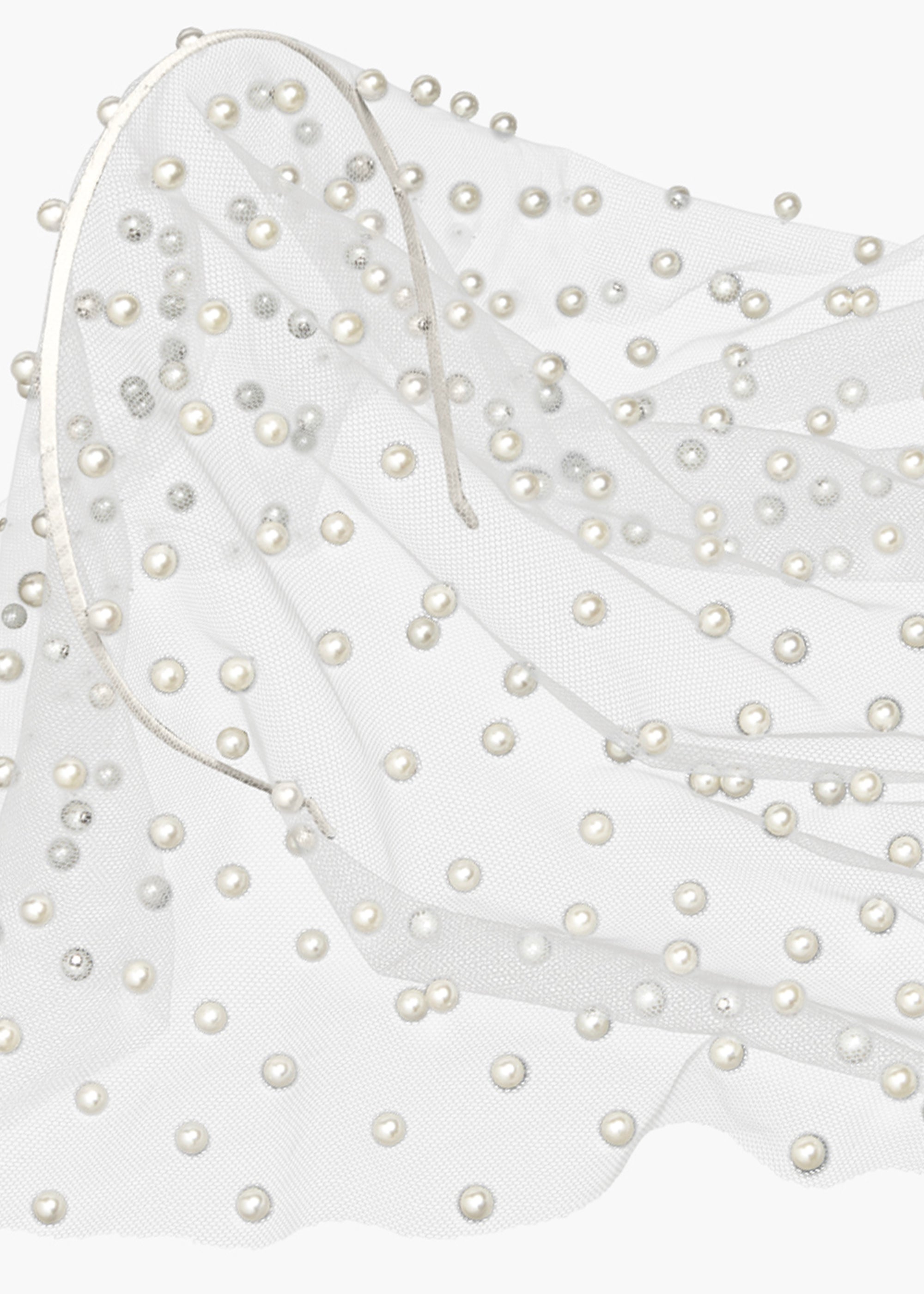 The Chiara Veil features shining pearls that are delicately hand-stitched to an ethereal mesh veil, enveloping the face in shimmering opulence. The placement of the peals creates a dramatic, obscured effect, offering a bold reinterpretation of the classic veil that blurs the line between seen and unseen, making every glance unforgettable.