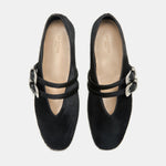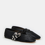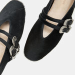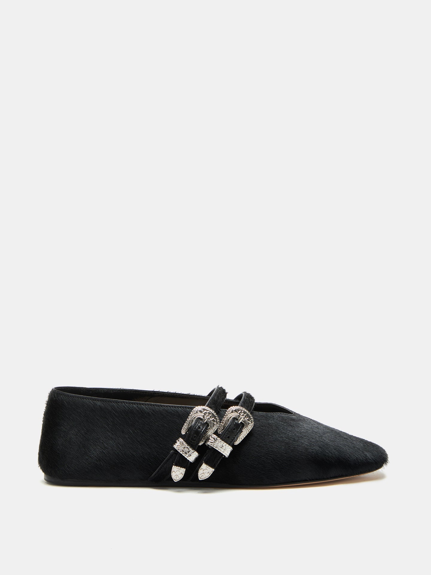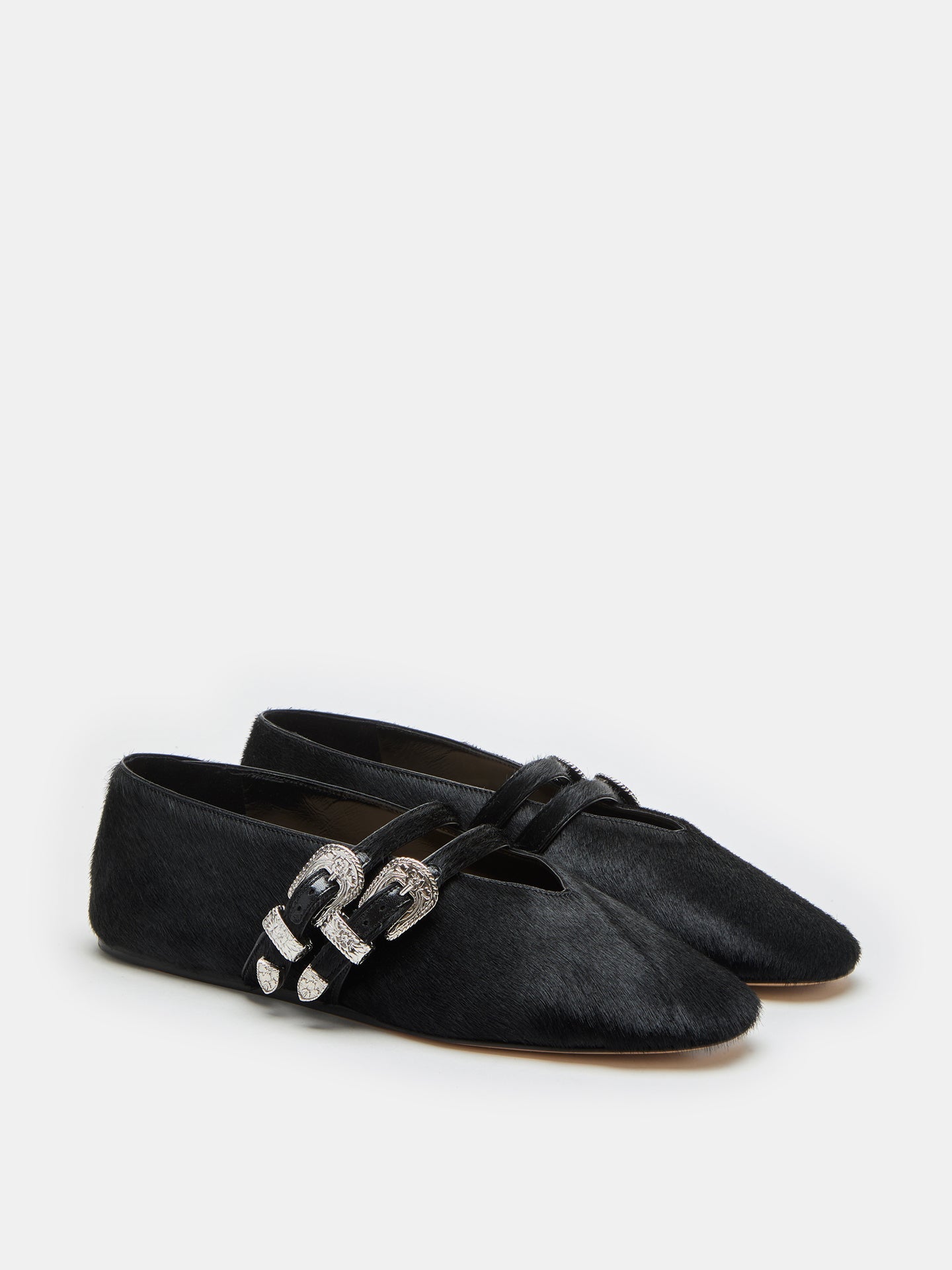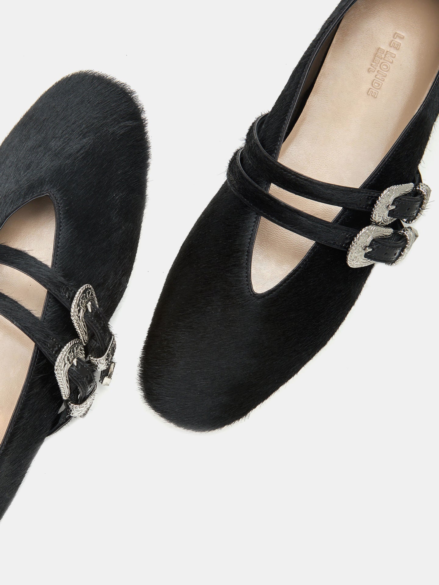 Claudia Slipper, handcrafted in black calf hair, with adjustable straps, western buckles in a new sacchetto construction, with a soft cushioned calf leather insole and leather piping. 8mm heel. Made in Italy.