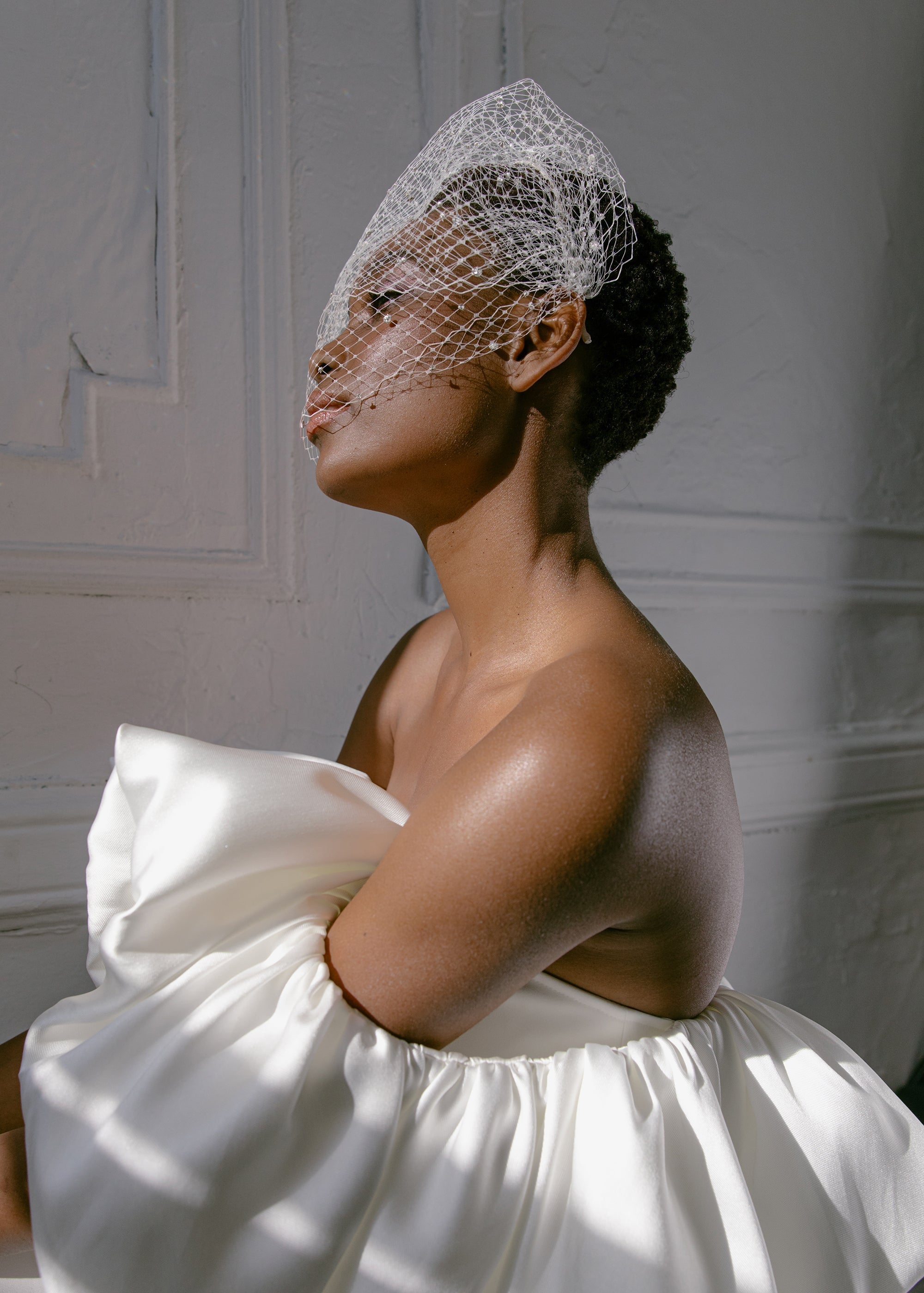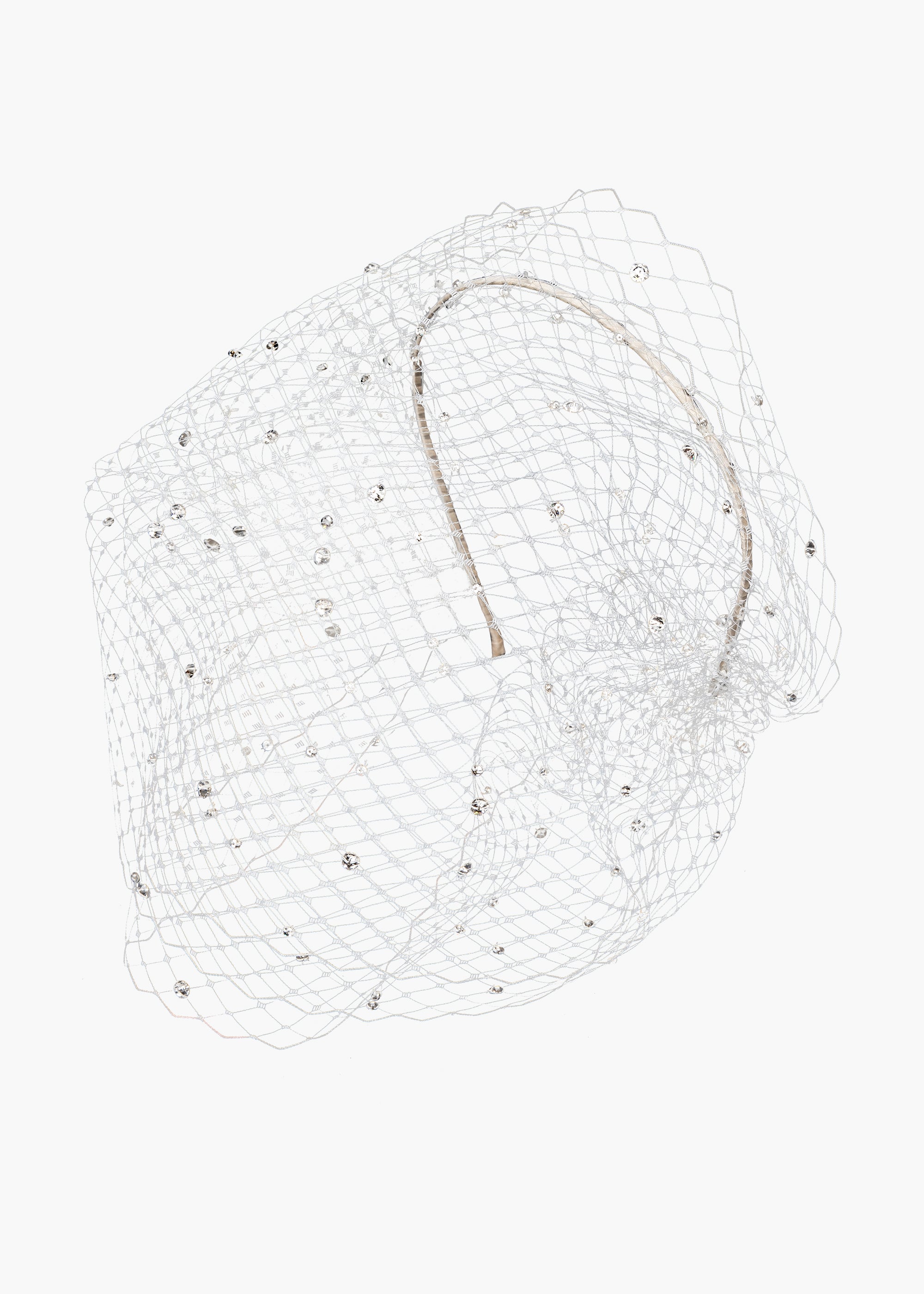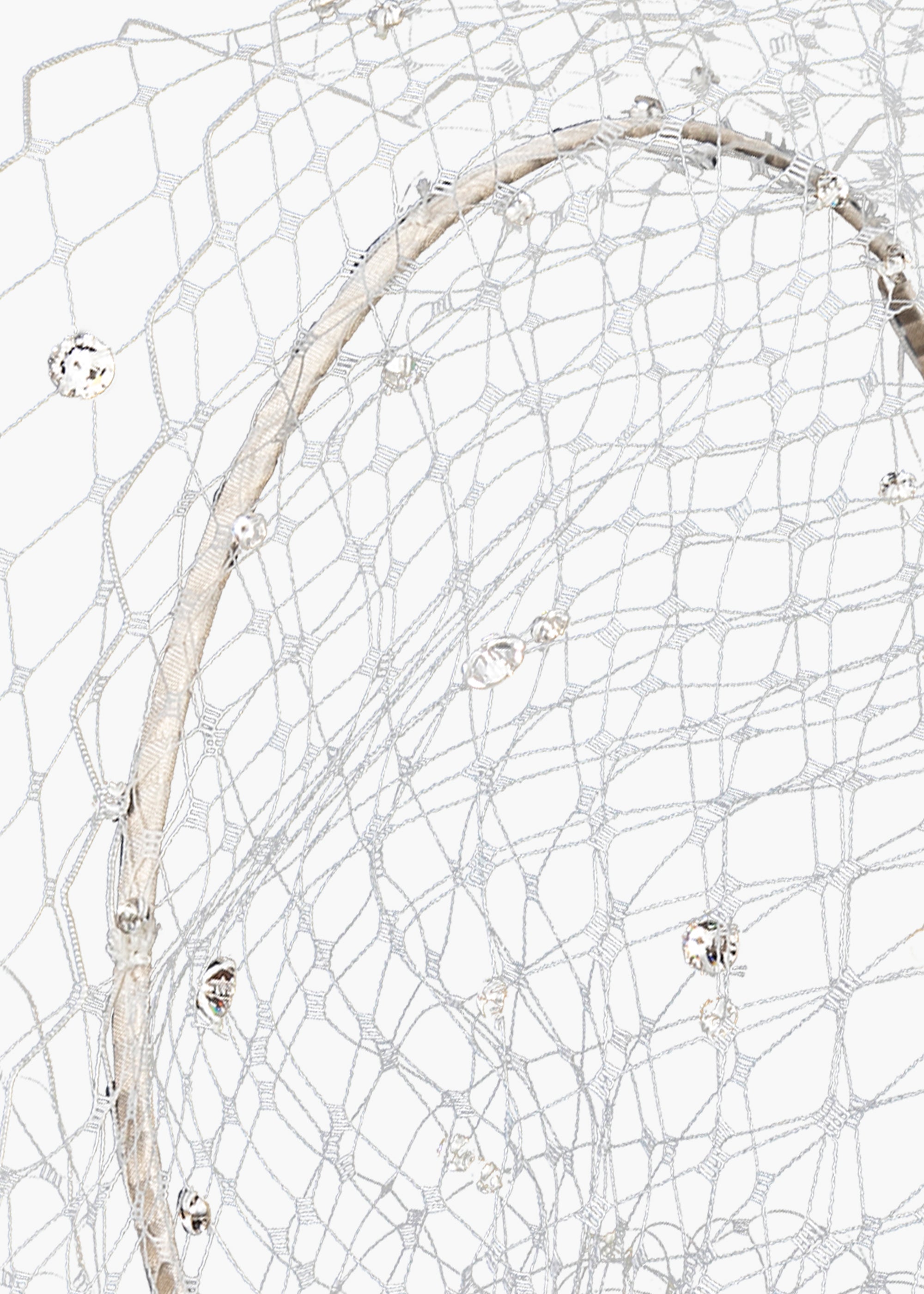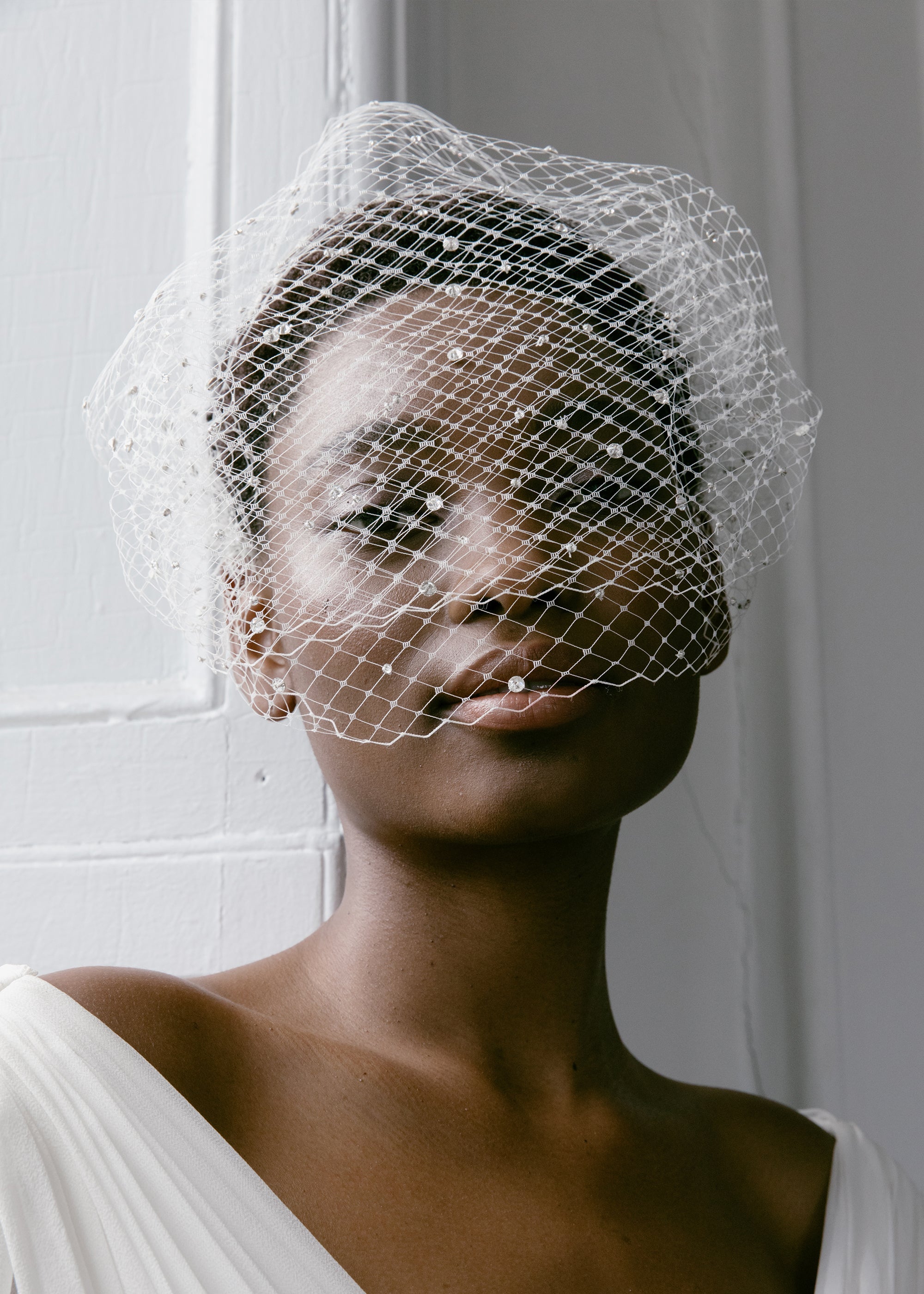 Bring the drama—the good kind, of course—in the Crystal Beehive Voilette Headband. This headpiece is masterfully crafted in our Brooklyn studio, consisting of hand-sculpted layers of French veiling, with hand-stitched Swarovski crystals scattered throughout, catching the light phenomenally. The veil sits on a thin silk-wrapped headband that disappears in the hair, leaving the focus on the voluminous crystal beehive.