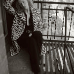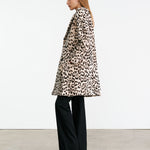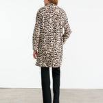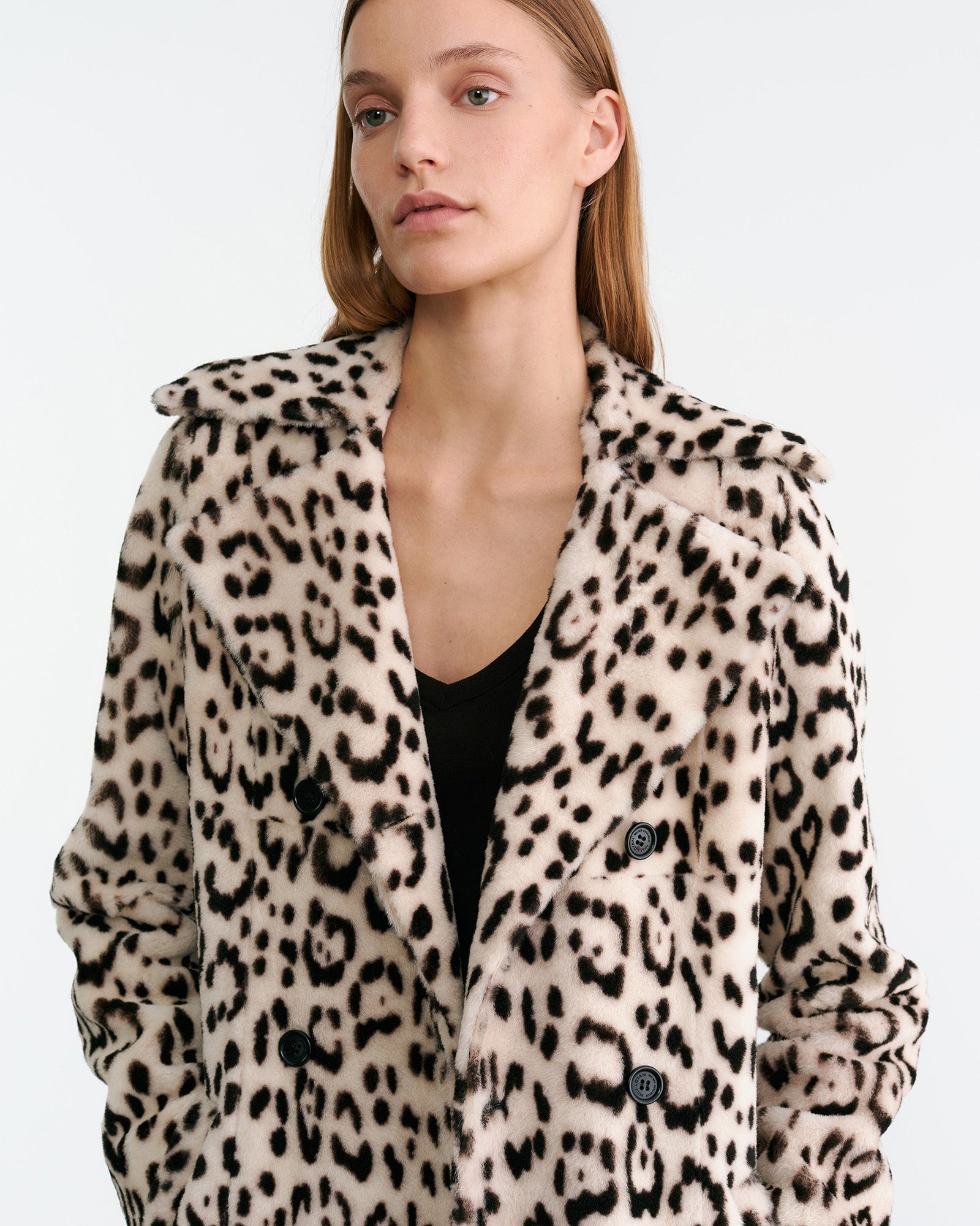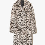 Double-breasted shearling coat in shaved merino skin with straight hair ironed Spanish merino featuring stone and black custom leopard print. Straight fit with exaggerated lapel and collar. Slant welt pockets. Fully lined with interior pocket.