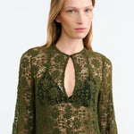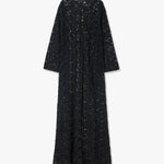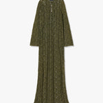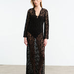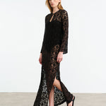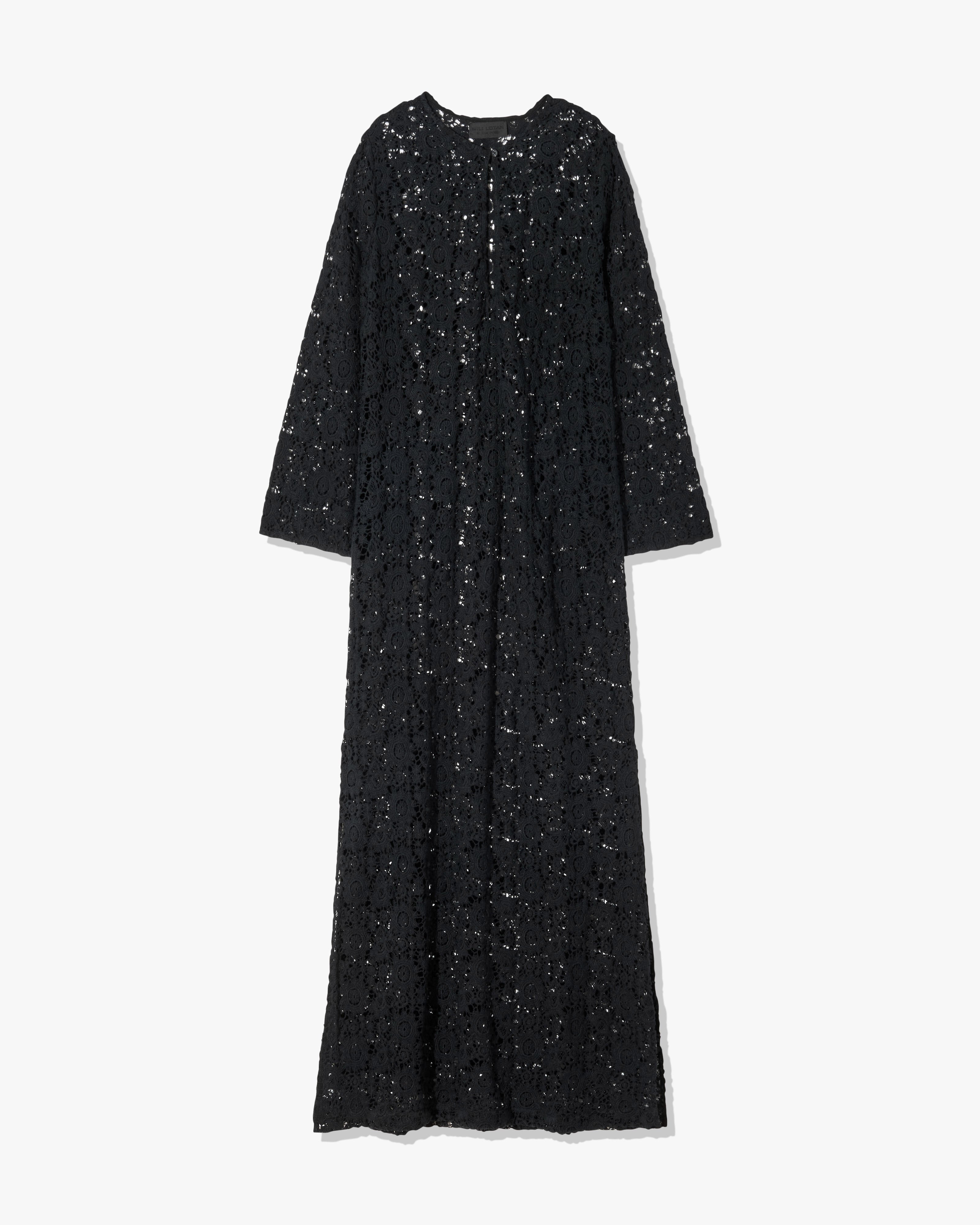 Full length dress in Indian cotton lace. Button closure at center front. Side slits.