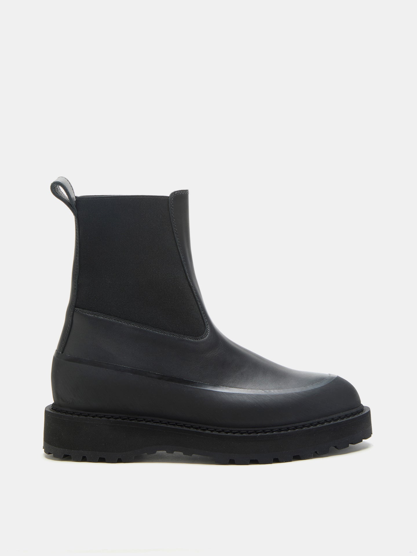 Dolomite Chelsea Boot, handcrafted in black leather with elasticated side panels, a cushioned calf leather insole and removable shearling inserts. Outer soles are anti slip rubber with a 25mm heel. Pull tabs. Made in Italy.